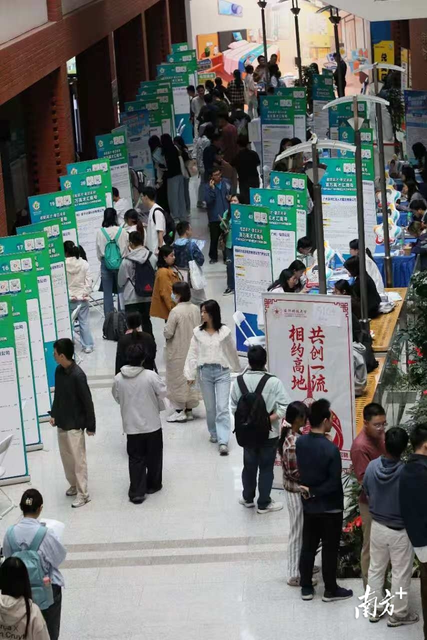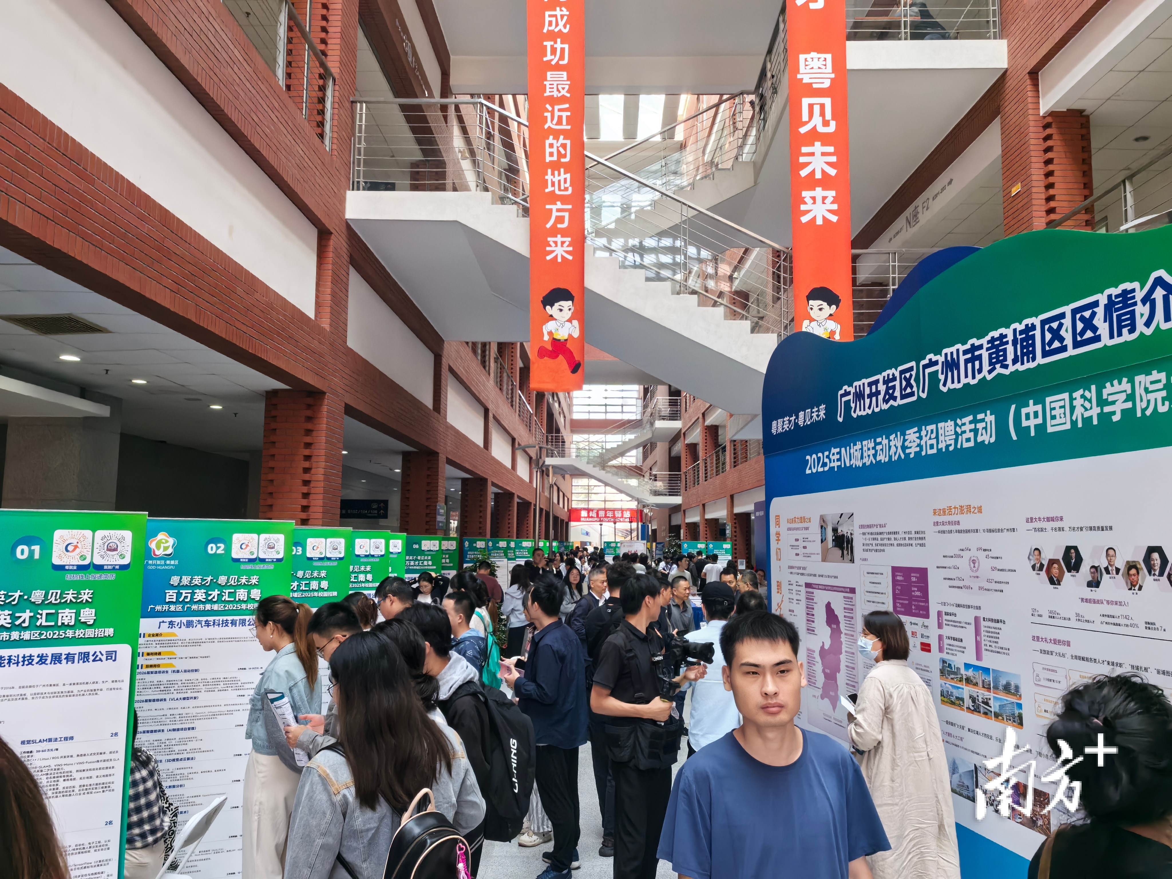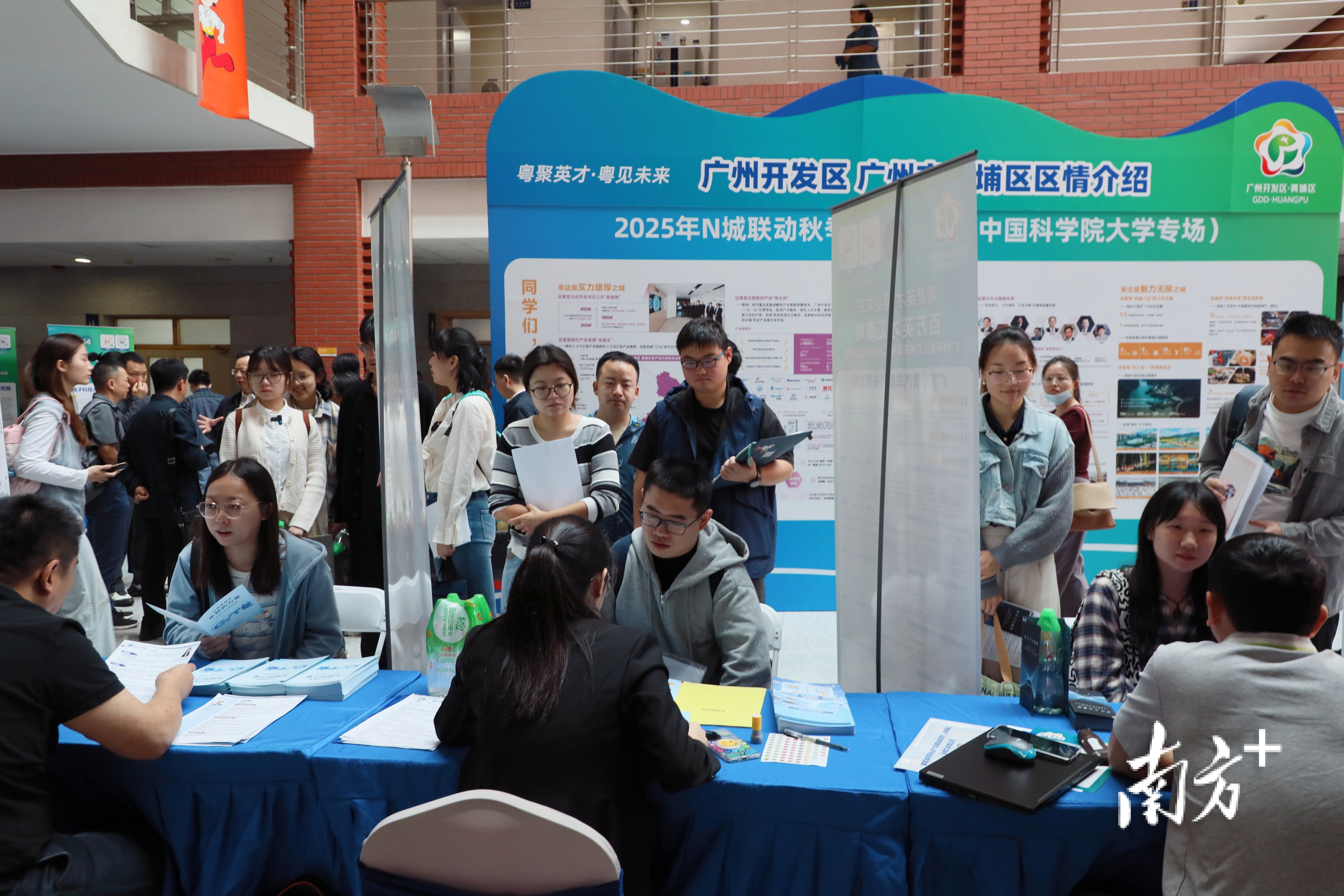 9月24日,中国科学院大学校园内,“百万英才汇南粤”2025年N城联动秋季招聘活动(中国科学院大学专场)现场人头攒动。广州开发区、黄埔区51家企事业单位展台前,汇聚了来自首都顶尖高校的莘莘学子。