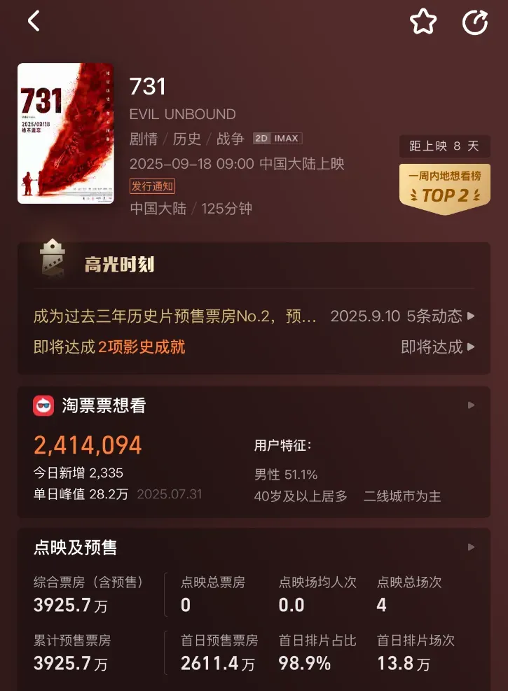 据灯塔专业版显示,截至9月10日,电影《731》预售票房已超4000万元,首日排片占比超98.9%。