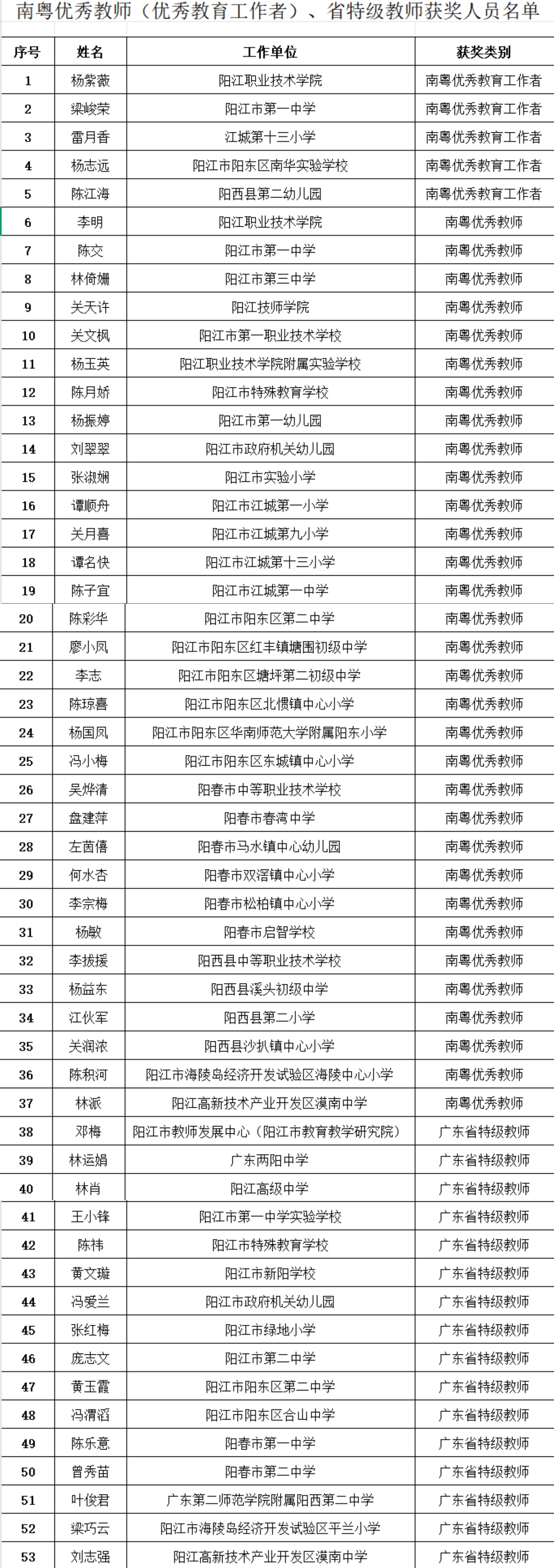 其中,阳江市有32名教师获评南粤优秀教师,5名教师获评南粤优秀教育工作者,16名教师上榜省特级教师。
