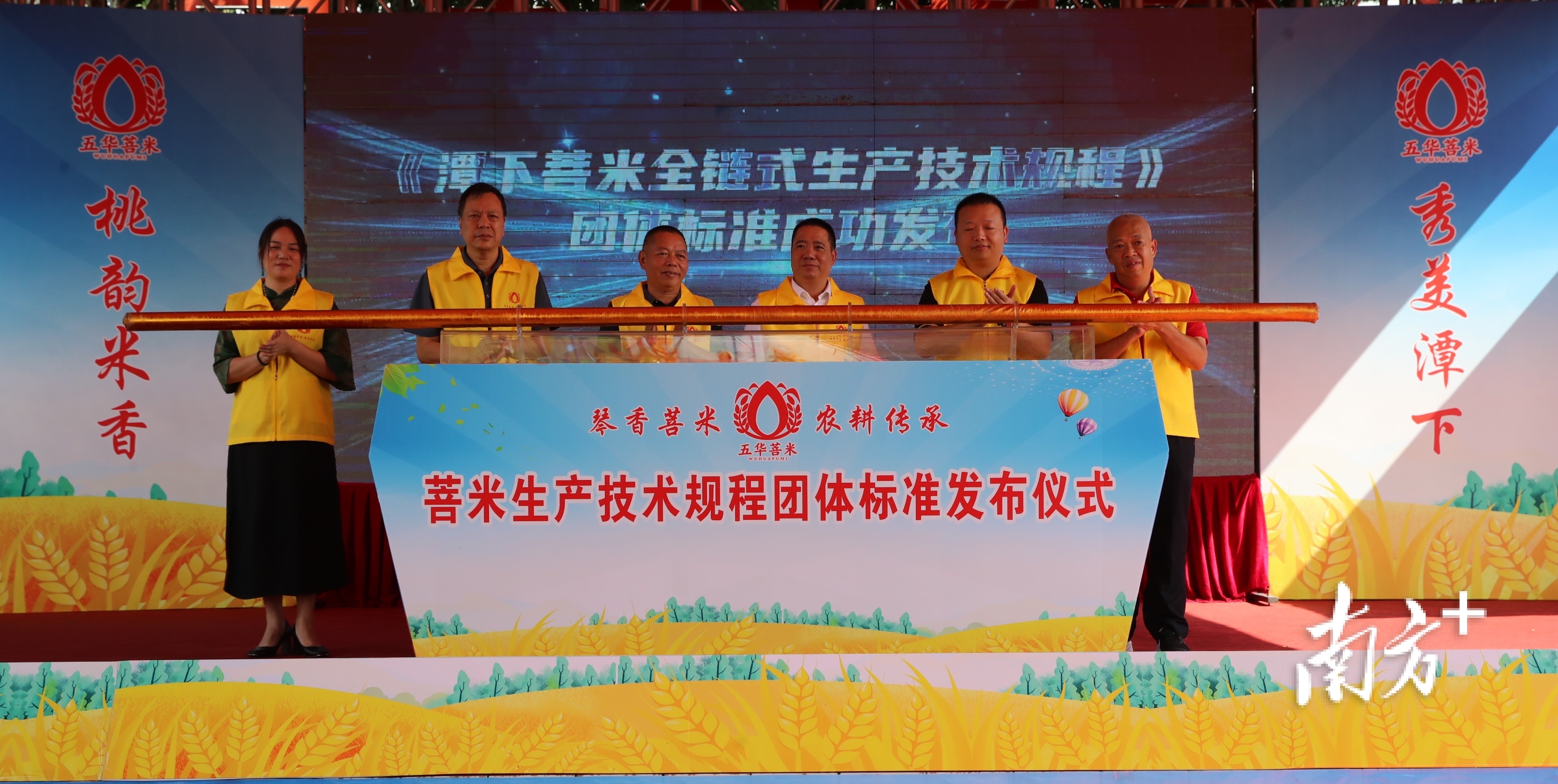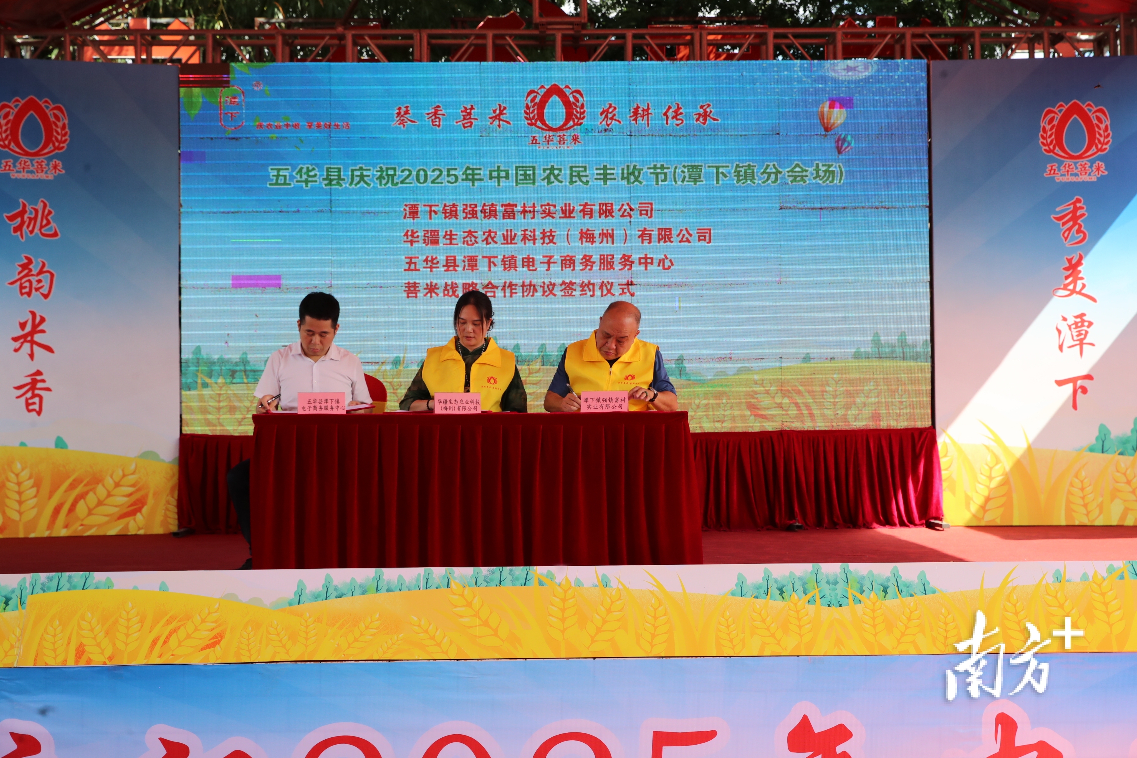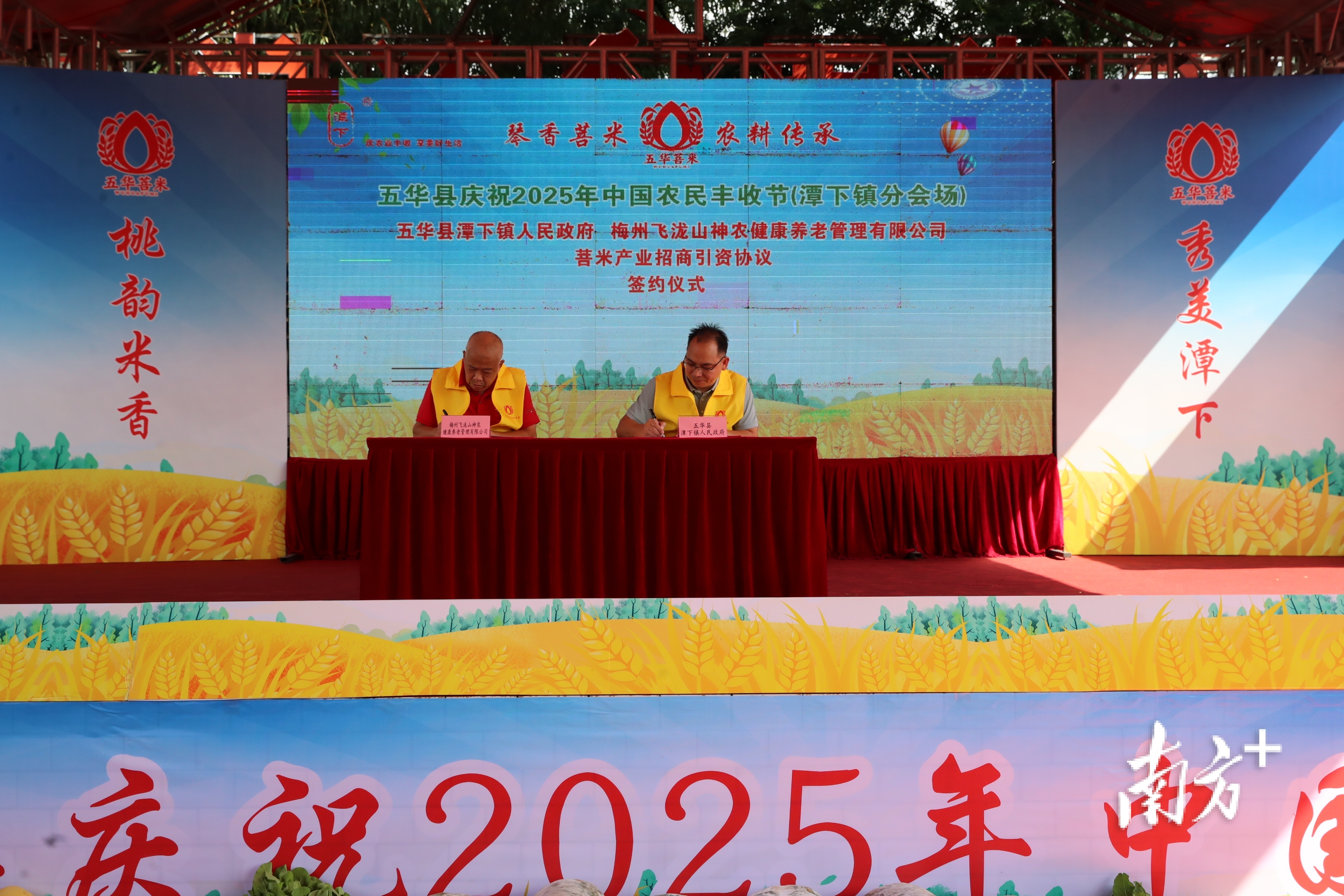 产业发展离不开标准引领与合作助力。活动现场,《五华菩米生产技术规程》《潭下菩米全链式生产技术规程》两大团体标准先后发布,为菩米生产划定“标尺”。更令人振奋的是招商引资签约环节,潭下镇人民政府与梅州飞泷山神农健康养老管理有限公司签订招商引资协议,潭下镇强镇富村实业有限公司等三家企业签订合作共建协议书,为潭下菩米产业注入新动能。