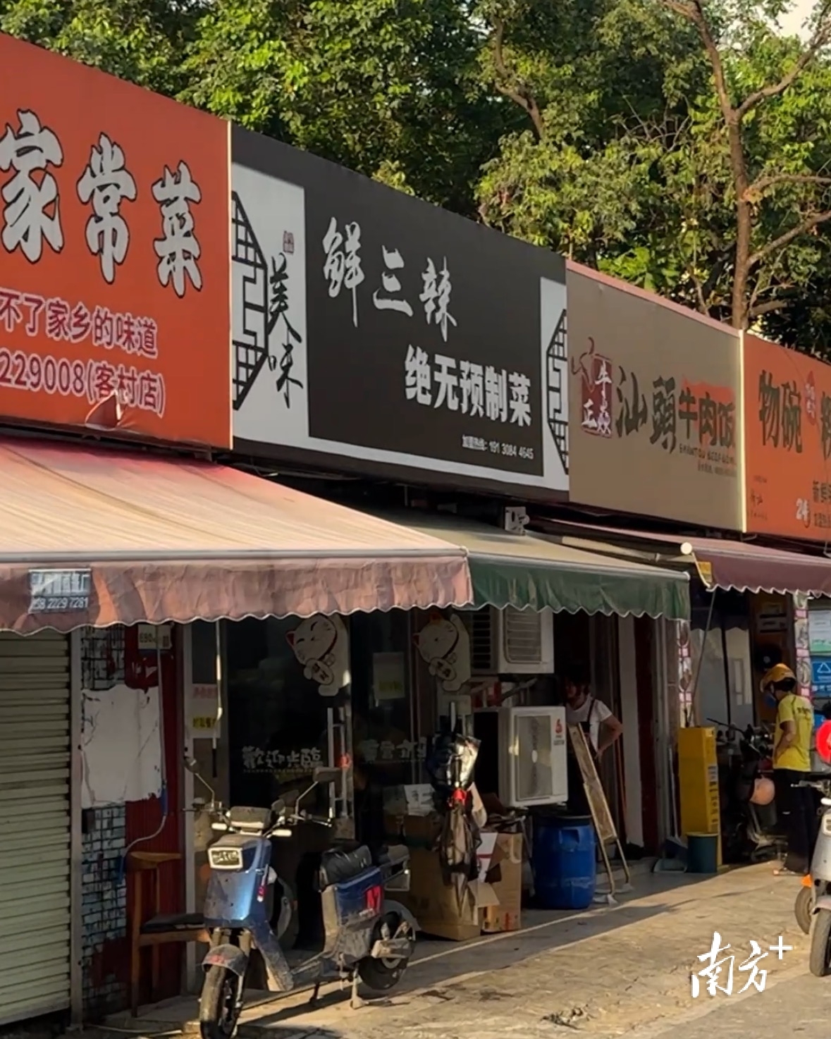 记者根据一家名为“王厨下山(客村店)”页面内提供的地址来到海珠区客村小学门口,此处一排档口有商户直接在招牌中打出“绝无预制菜”。