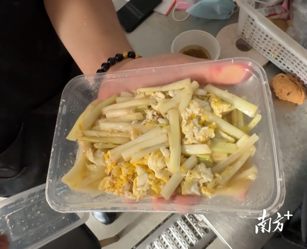 商家展示一盒因出品时间太久而丢掉的菜品。