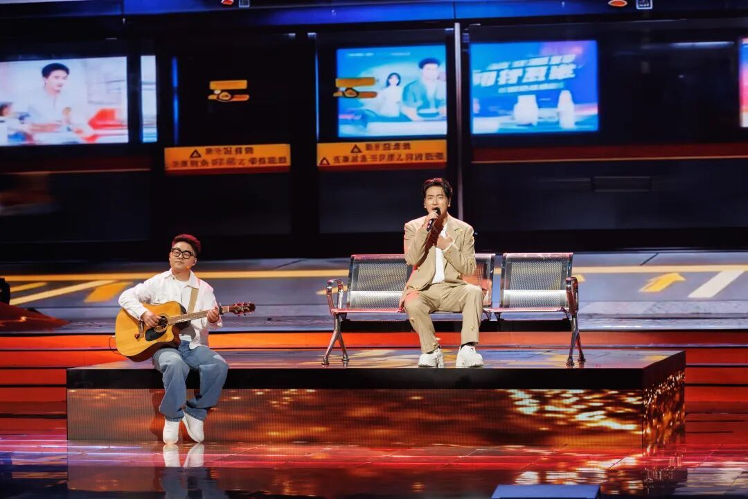 2026年湾区春晚录制现场,吴欢(左)和海来阿木(右)表演歌曲《嘉禾望岗》,舞台上搭建了广州嘉禾望岗地铁站站台的场景。(受访者供图)