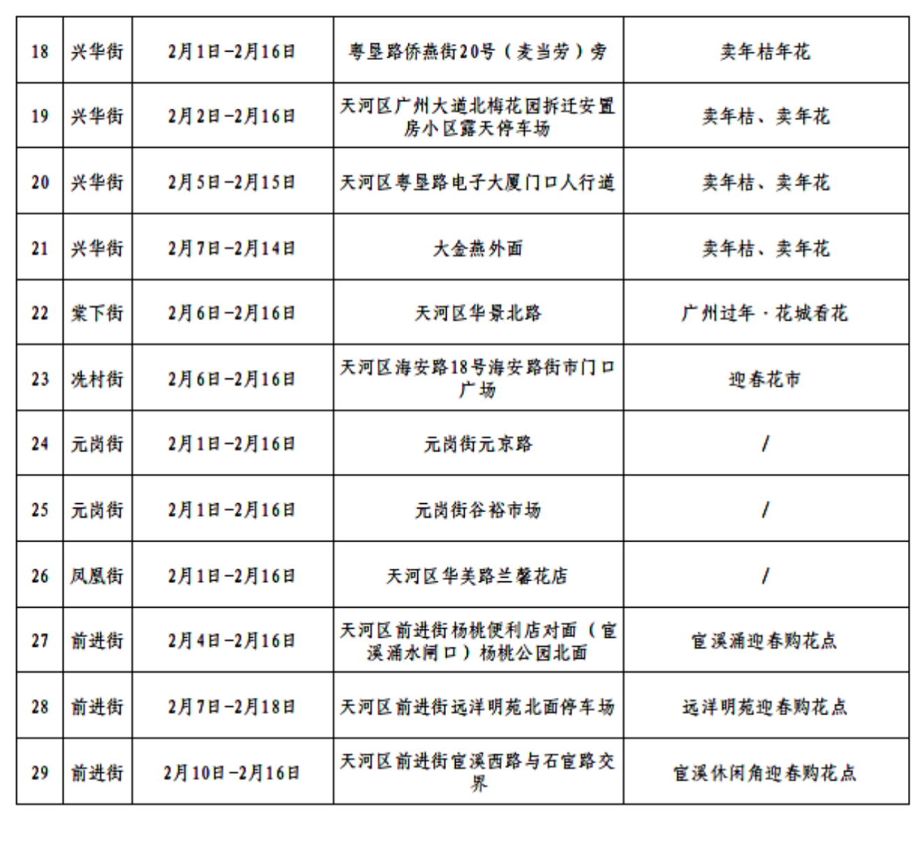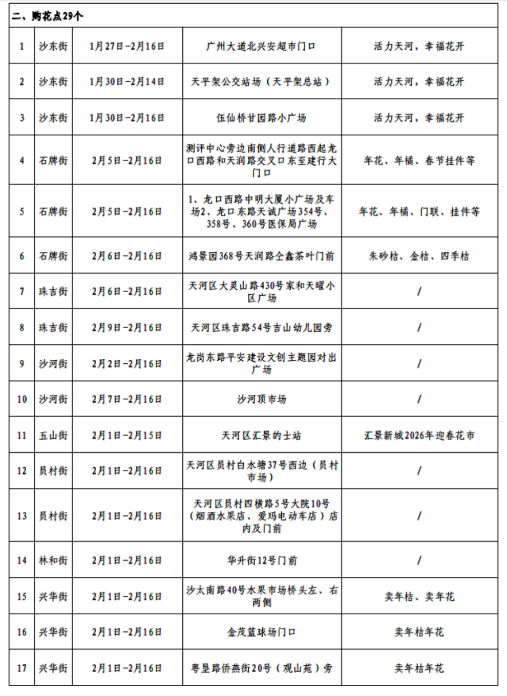 附:2026年天河区迎春花市便民花市和购花点一览表(更新至2026年2月5日)