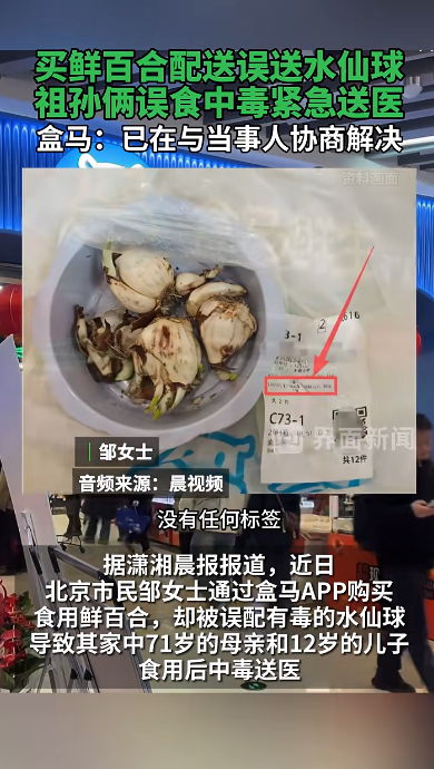 据消费者周女士讲述,1月2日,她为了给感冒的孩子煮汤,在北京一家盒马mini门店下单购买了鲜百合,货品由家中老人代收。但未曾想,盒马送来的并非鲜百合,而是外形与其相似的水仙球,且相关标识印于包装盒侧面位置。老人在不知情的情况下用水仙球煮汤并和孩子饮用后,相继出现头疼、肚疼、头晕和剧烈呕吐等症状。