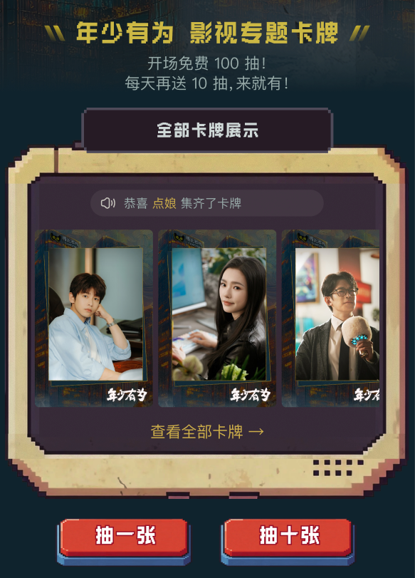 目前,起点读书APP已同步上线多款联动玩法,通过“追剧情”等模块,实现剧集与原著章节一键同步,帮助观众无缝切换至深度阅读。同时,秉持原著精神,起点还上线了《年少有为》影视专题卡牌活动,用户不仅可获100次免费抽卡机会,每日还可额外领取10次——不肝不氪,就可以享受“欧皇”的乐趣。此外,起点读书还推出全订用户专属福利、阅读版“孤独的公路”、弹幕打卡等活动,完成相关任务的读者,可获得签名照、云包场席位、亲签实体书等福利。