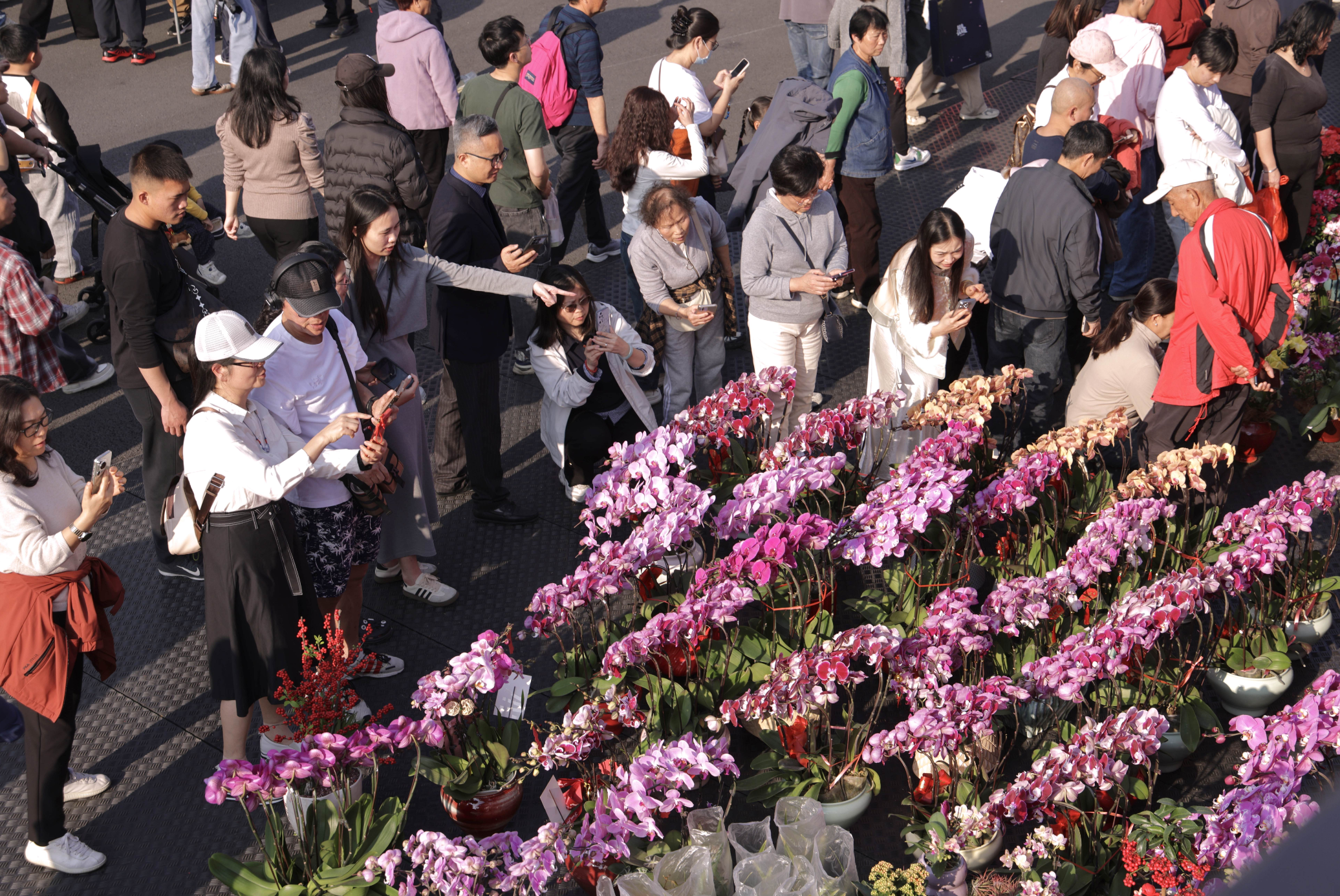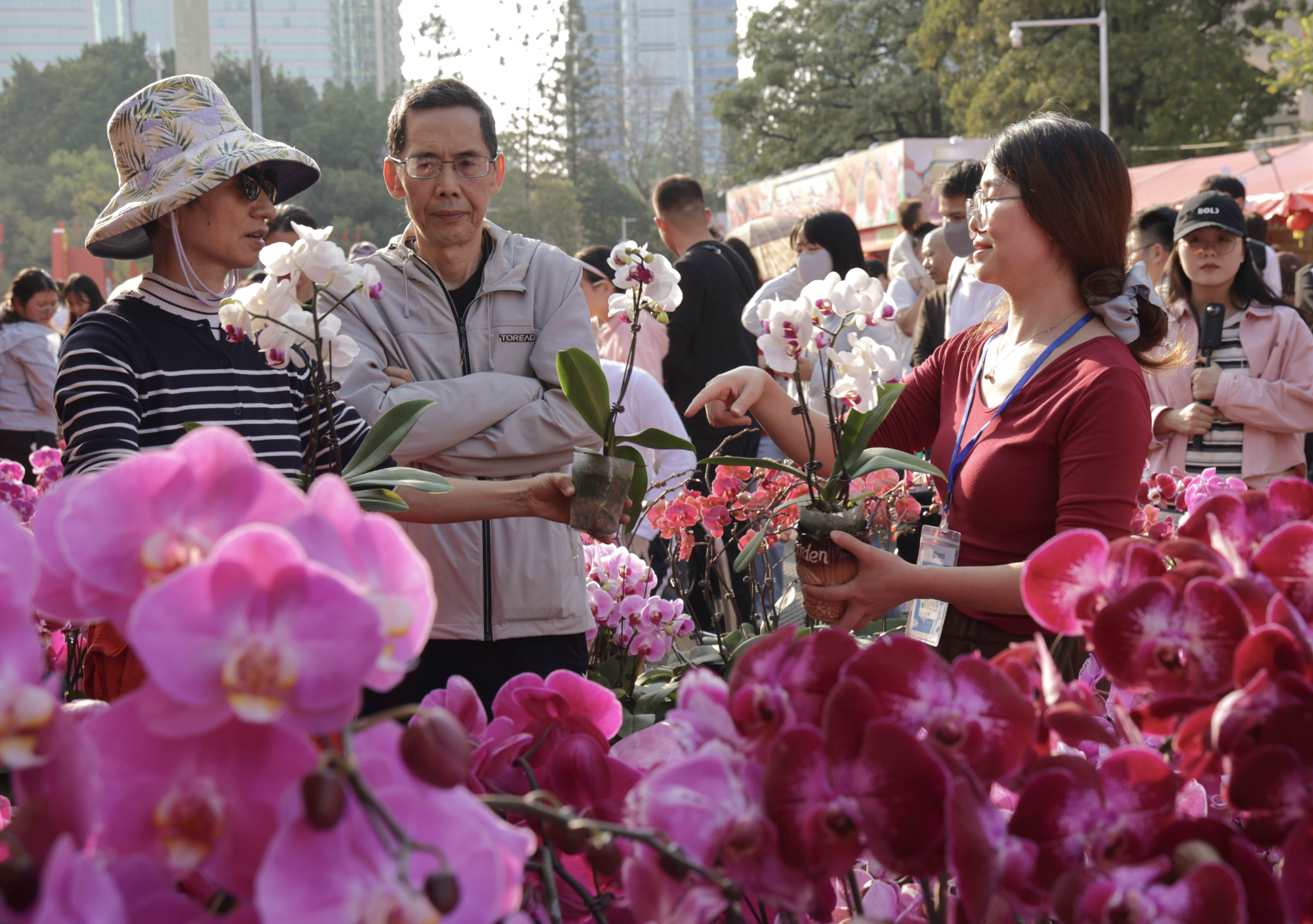 今年花市共设置各类档口403个。其中花卉档口总计228档,占总档口的57%。大花档、小花档、桃花金鱼档满足年花消费刚需,年货档、工艺品档烘托节庆氛围。尤为值得一提的是,花市特设16个花卉主题公益档、20个非遗档位,以及帮扶、助残、义卖等公益档口,让花街既有年味,更有温度。