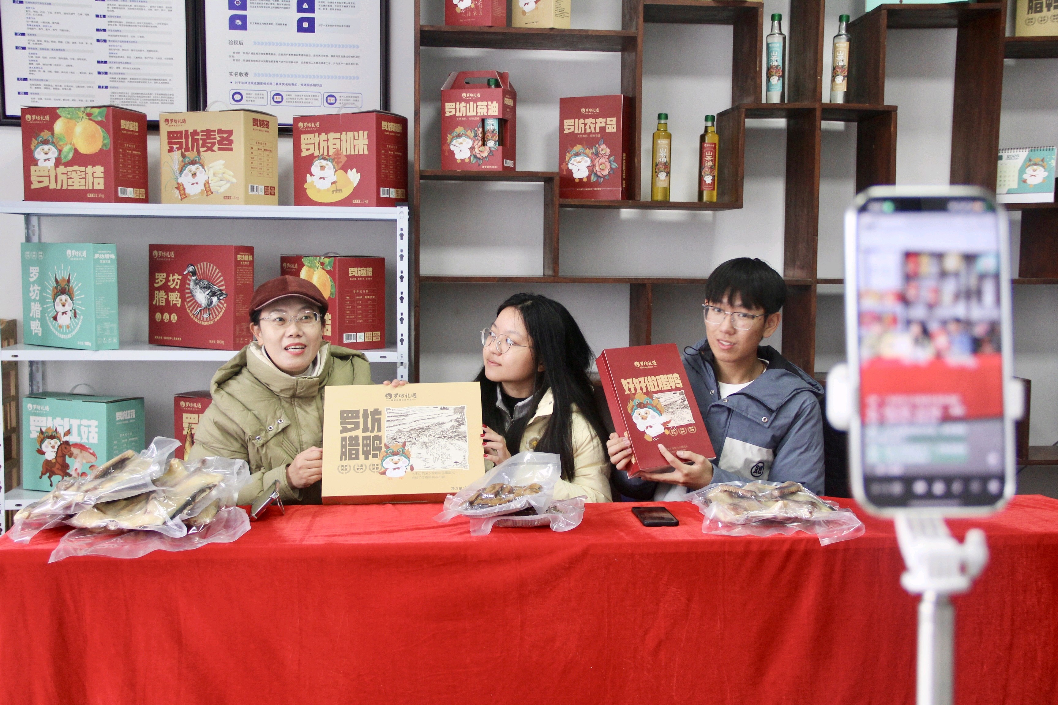 在助农实践中,实践团走进农户家庭与腊鸭晾晒棚,近距离调研罗坊腊鸭的制作工艺、文化内涵与产业发展现状。棚内,成排腊鸭悬挂于竹竿之上,山风穿堂而过,裹挟着浓郁咸香扑面而来。当地农户介绍,罗坊腊鸭选用养足100天的白羽胡鸭作为原料,确保肉质紧实鲜嫩;晾晒环节完全遵循自然规律,北风天气需十日左右,遇阴雨则顺延工期,全程恪守“慢工出细活”的传统原则。这一看似朴素的制作流程,实则凝结着罗坊乡自元代以前延续至今的生活智慧与民俗文化。2019年,罗坊腊鸭被认定为国家地理标志商标,成为当地极具代表性的乡土品牌。