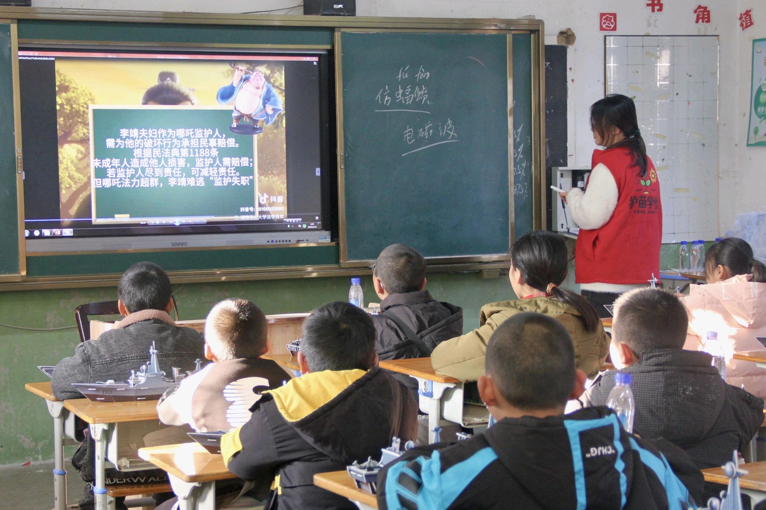 在罗坊乡的“护苗学堂”,实践团面向当地儿童开展课业辅导、“云游中国”主题科普课堂及未成年人保护法律宣传。“护苗学堂”是当地政府重点打造的公益教育平台,吸引了来自清华大学、西北工业大学、南昌大学、首都师范大学等多所高校志愿团队参与,通过整合社会与高校资源,为乡村儿童提供多元化课后服务。实践团通过互动式教学与情景化讲解,增强儿童安全意识与法治观念,以实际行动将“护苗”工作落到实处。
