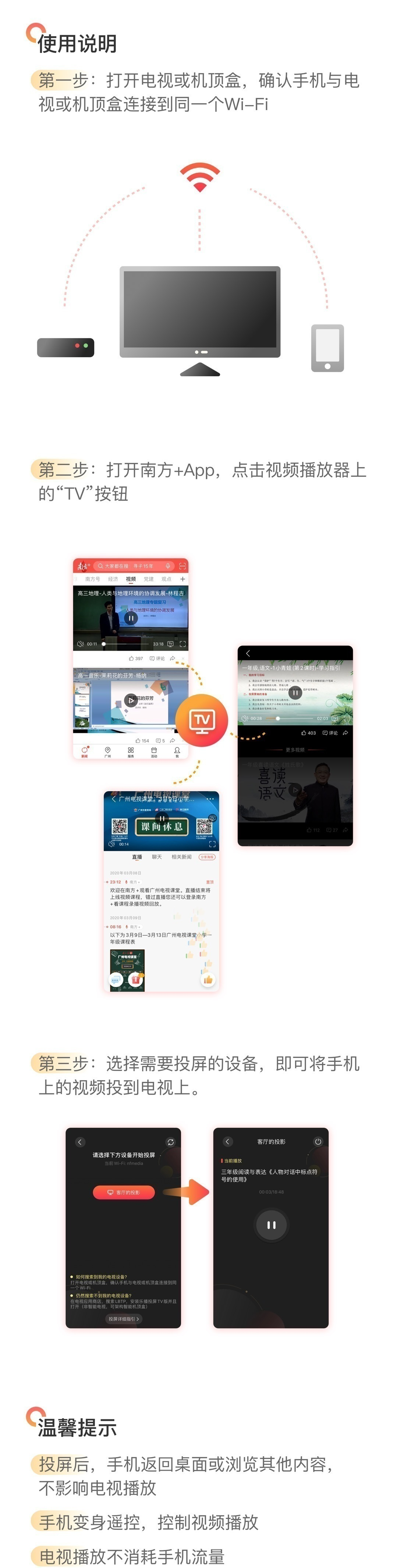 【温馨提示】南方+视频直播支持电视投屏。您可以下载南方+客户端,根据下图指引进行操作就可以在电视大屏上收看啦!