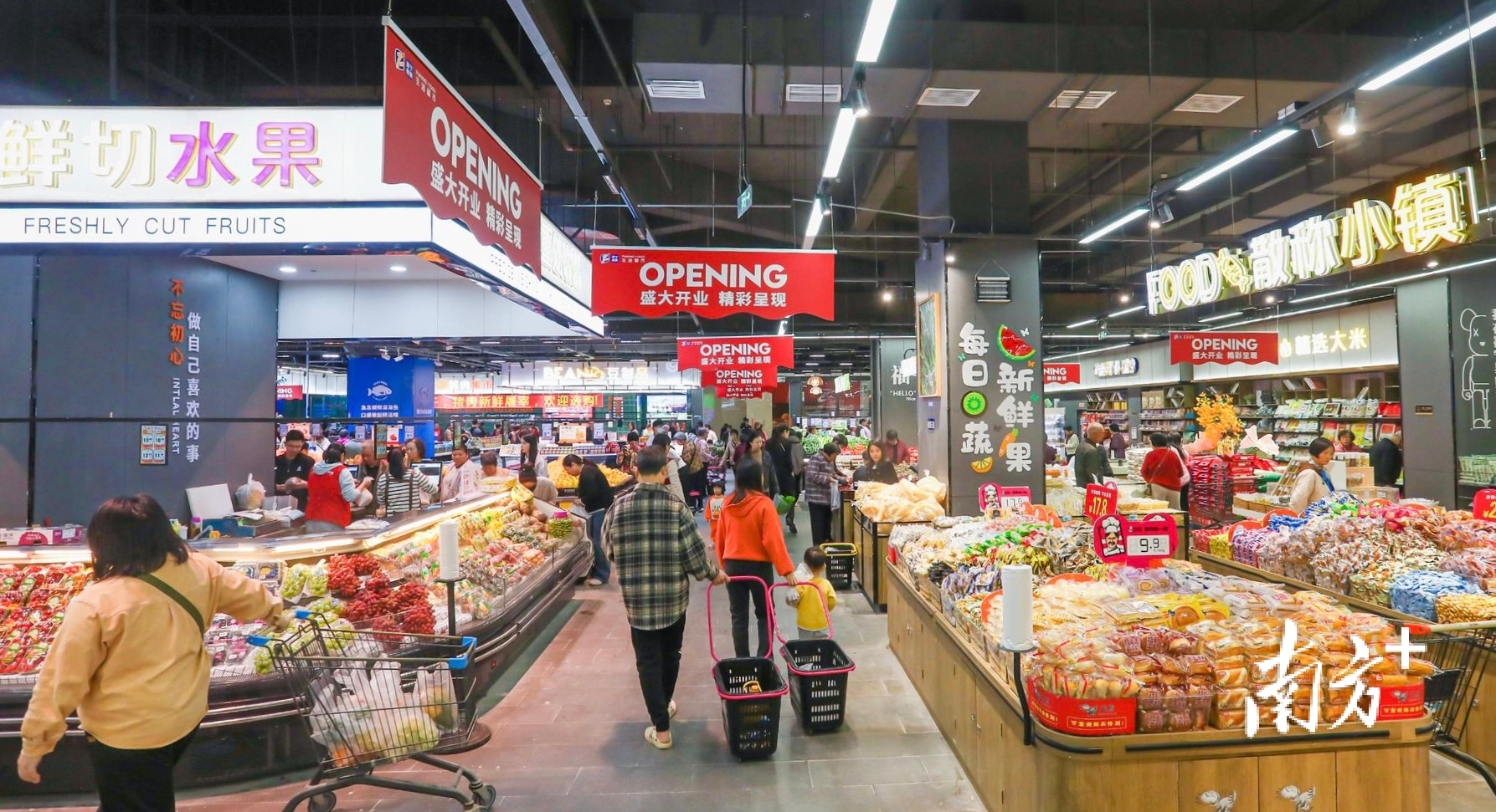 “我们打造‘生鲜+现制美食+居家日用’的复合型业态,商品种类超6000种。”广东福宁易购超市有限公司董事长夏健华介绍,超市建立每日直采机制,确保生鲜食材凌晨产地取货、清晨门店上架。“我们还持续引入优质‘广货’,让居民在家门口就能一站式购齐日常所需与特色年货。”据悉,该超市日均客流稳定在1400至1600人次,周末及节假日可达2000人次以上,升级后客流同比增长超过20%。