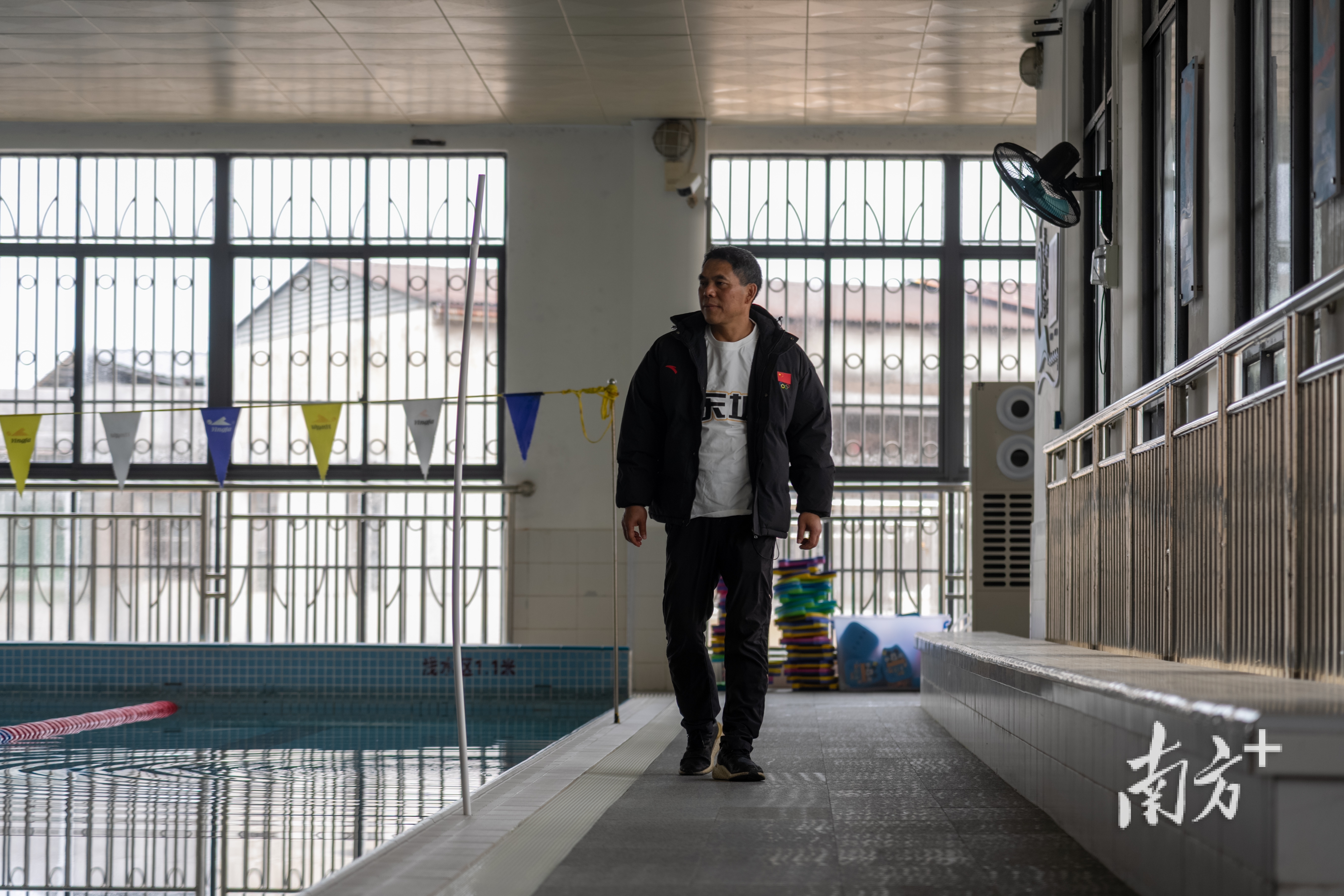 章新宏在曾经任教体校的泳池旁走过。