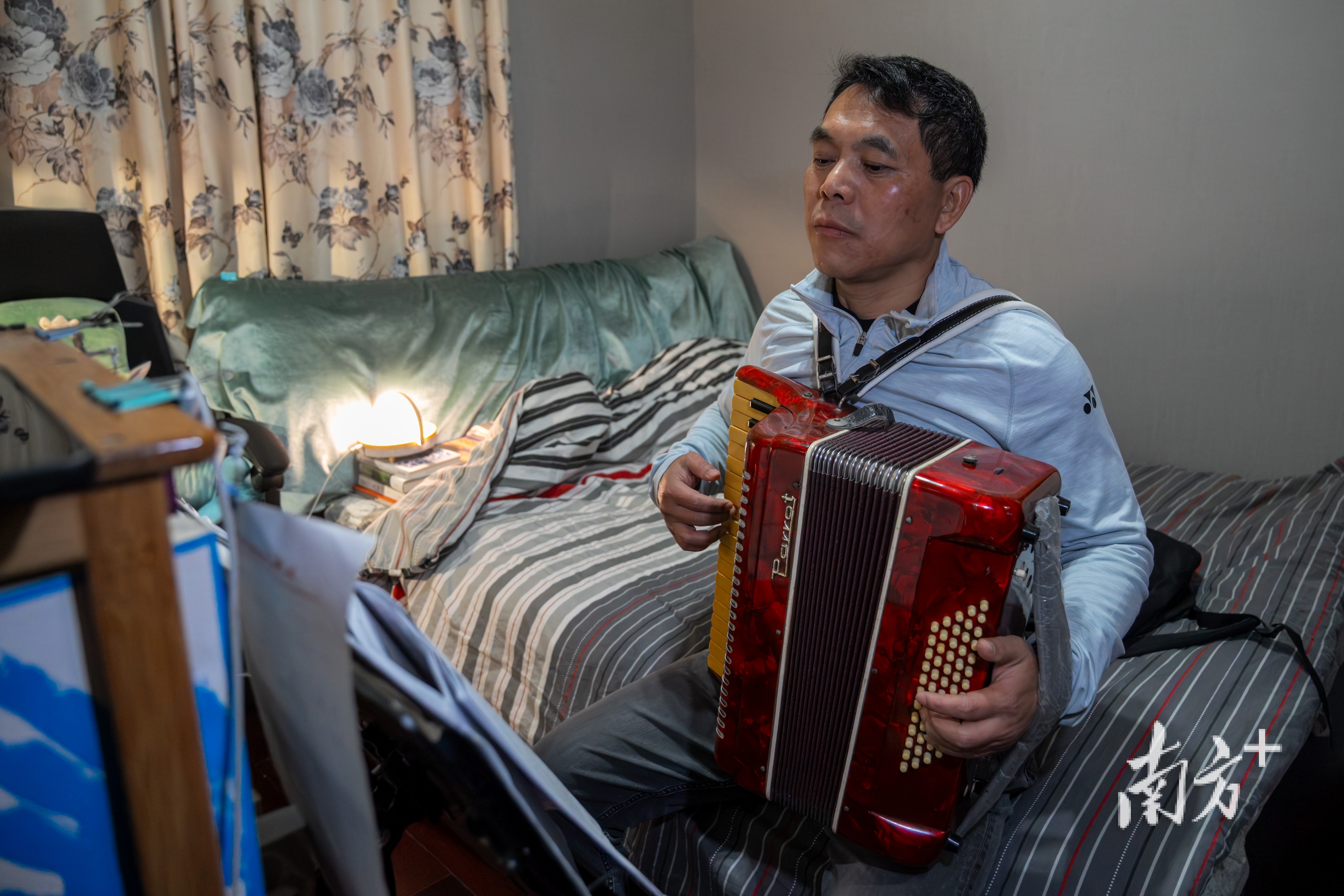 章新宏跟着网课学手风琴。