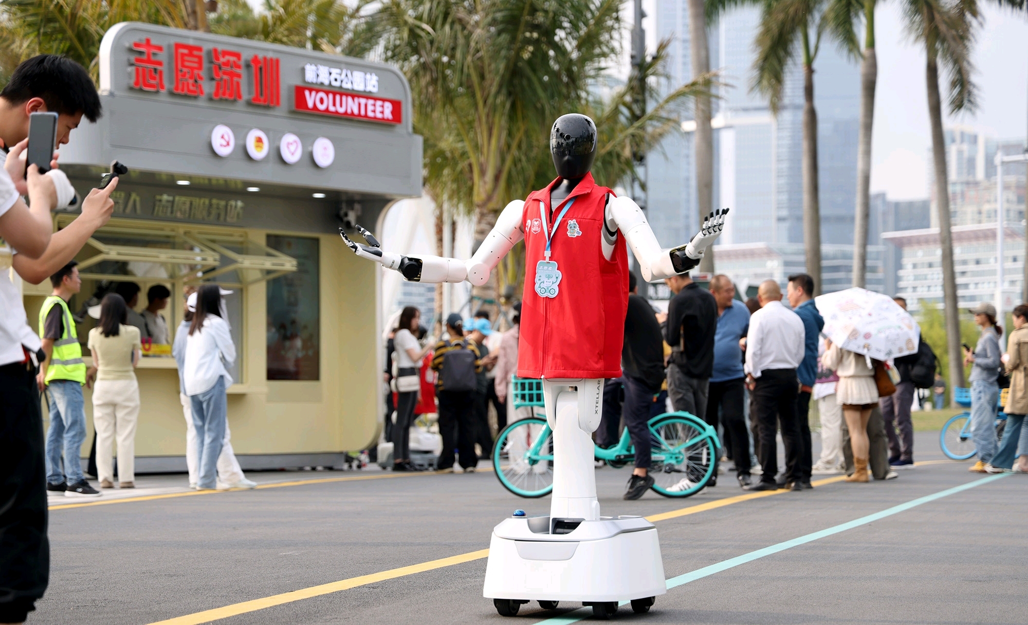阳光洒落前海石公园海岸,机器人志愿服务U站前人流不断,科技感与烟火气在此相融,成为一道兼具科技与文明温度的亮眼风景线。