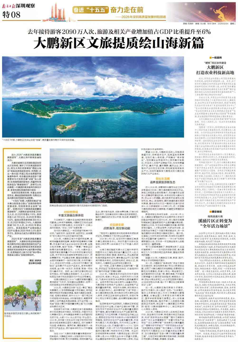2026年是“大鹏旅游高质量发展提质年”。大鹏新区将加快构建具有大鹏特点和大鹏优势的现代化产业体系,加快建设世界级滨海生态旅游度假区和全球海洋中心城市集中承载区,在更高起点上奋力打造“绿水青山就是金山银山”实践创新标杆。