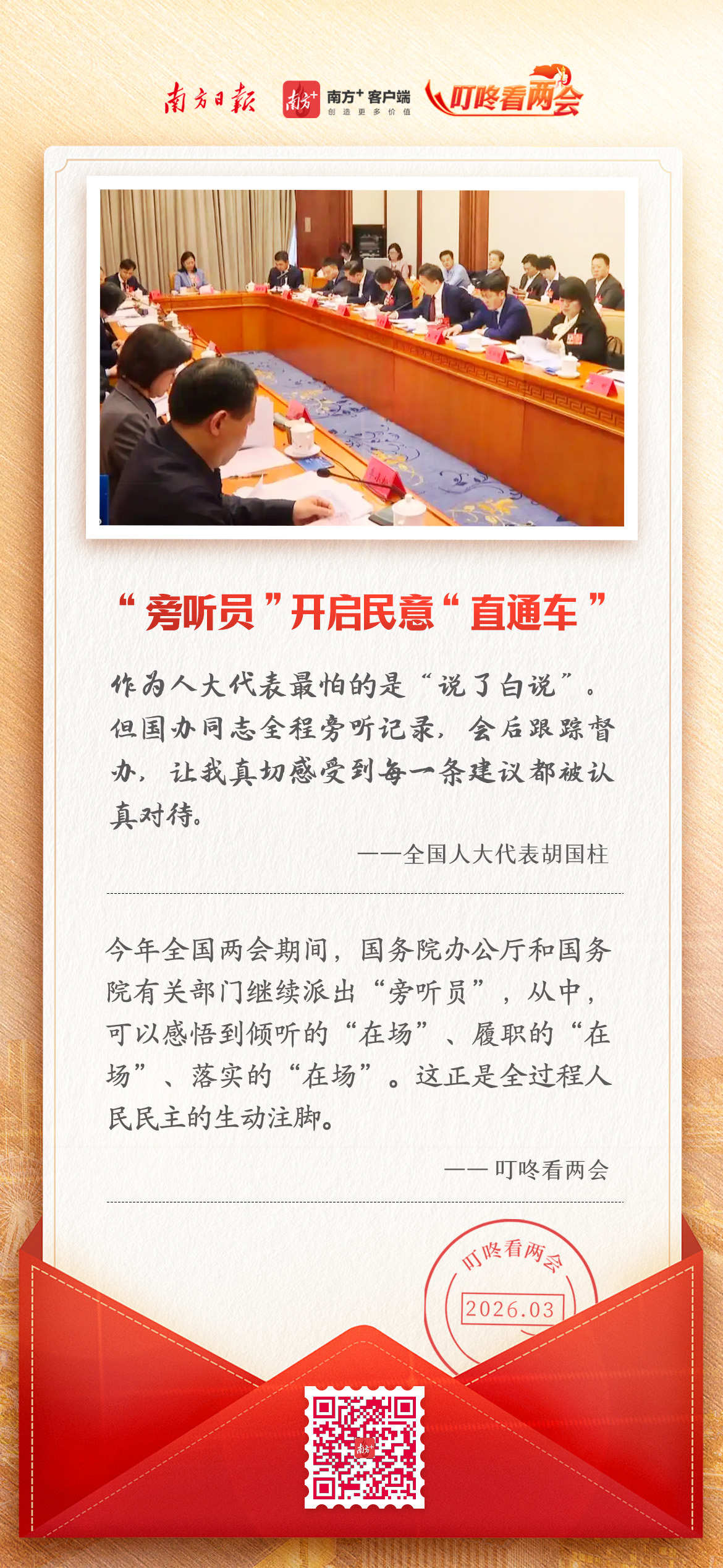 旁听全国两会,是国务院办公厅和国务院有关部门听民意、汇民智的重要举措,自2016年起实行至今。以制度化、程序化的形式,确保听到基层的声音,本就是一种民主的“在场”。而原汁原味的记录,坦诚高效的沟通,正如一台无形的“民意直通车”,“面对面”背后透着“实打实”。