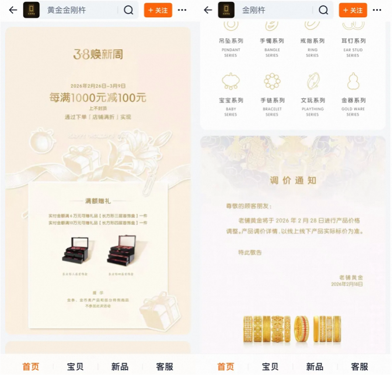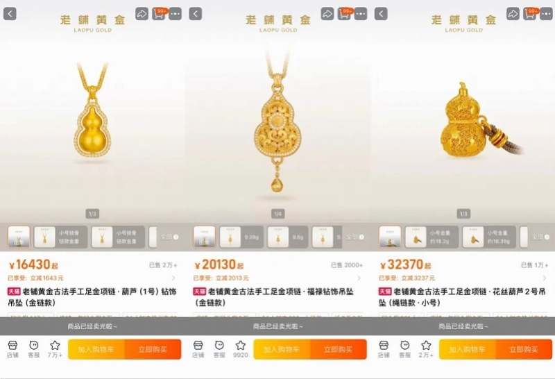 老铺黄金天猫3·8焕新周活动信息及调价通知。2月26日14点,老铺黄金天猫旗舰店开启1000-100活动,1秒成交额破3亿元,全天销售10亿元,产品大面积产品售罄下架。62.75万元金碗10分钟内售罄,其他包括售价超17万的黄金貔貅、超20万的黄金如意、超30万的黄金蟾蜍、超50万的黄金鸳鸯摆件等高价商品亦显示“已经卖光啦”。同时有超30款单品上架即被秒空。其中,古法手工足金项链十字金刚杵钻饰吊坠两款货品单日成交均近亿;八宝随身金佛、葫芦钻饰及七子葫芦吊坠等5款单品单日成交破5000万;另有近30款单品单日成交破1000万。