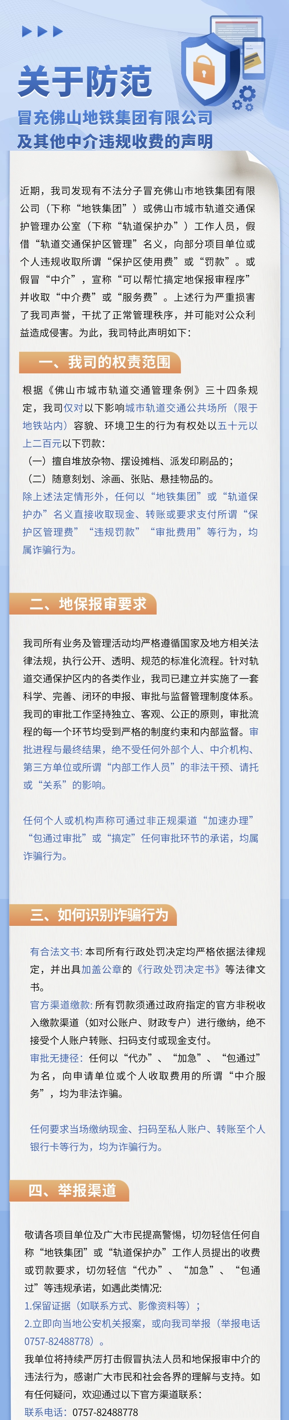 近日,佛山地铁发布公告称,发现有不法分子冒充佛山市地铁集团有限公司或佛山市城市轨道交通保护管理办公室工作人员,假借“轨道交通保护区管理”名义,向部分项目单位或个人违规收取所谓“保护区使用费”或“罚款”。同时,还有人假冒“中介”,宣称“可以帮忙搞定地保报审程序”并收取“中介费”或“服务费”。