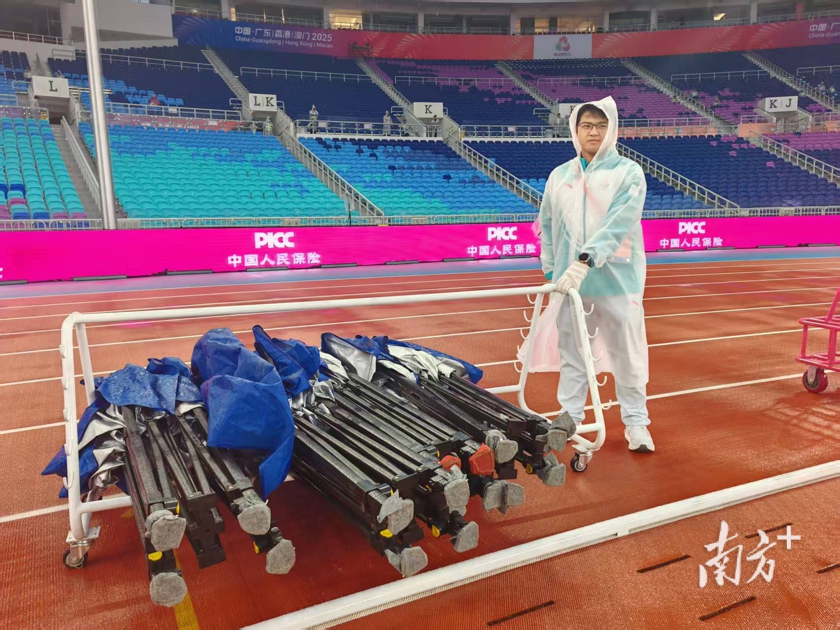 余卓斌在田赛器材保障的岗位上,对团队协作有了更深的理解。他回忆起一次“刻骨铭心”的经历:需要在8分钟内拔除上百个马钉、卷收几十米标识条、归位所有标枪。“任务量大、时间紧,但我们以分区作业、流水动作完成了这次高压挑战。那一刻我深刻体会到,即使我们站在后台,但正是这样的后台力量,让比赛能如同舞台秀一样顺畅亮相。”