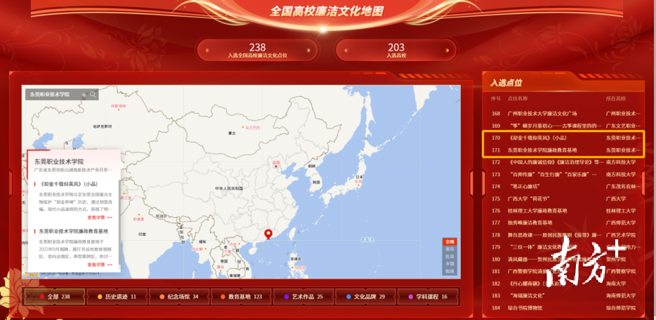 近日,记者从全国高校思想政治工作网获悉,东莞职业技术学院廉政教育基地、廉洁小品《却金千载仰英风》同时入选教育部第十届高校廉洁教育系列活动成果之一《清风印迹——全国高校廉洁文化地图》。据悉,东职院是全市唯一入选高校、全省唯一同时入选2个点位的高职院校、全国唯一同时入选教育基地及廉洁小品的高校。