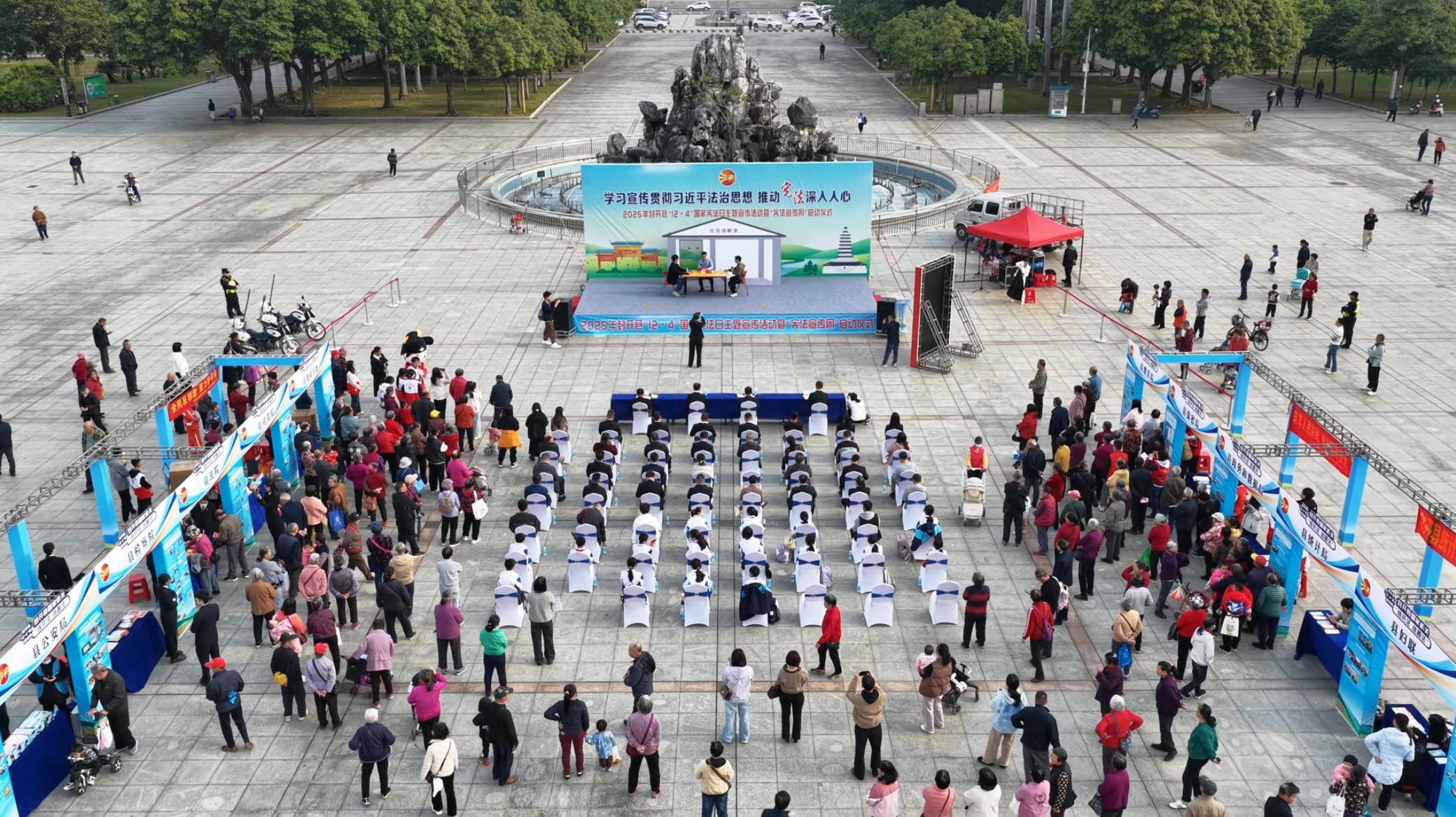 宣传触角深入基层与边疆。各镇街同步开展活动10余场,实现全域覆盖;全县中小学通过升旗仪式、宪法晨读强化青少年宪法意识;十佳普法小使者录制短视频,以童言童语传递法治精神。更富特色的是,封开联合广西邻县在“粤桂文明集市”摆起法治摊,用方言解读、派送“粤桂法治大礼包”,让宪法精神在省际烟火气中润泽民心。