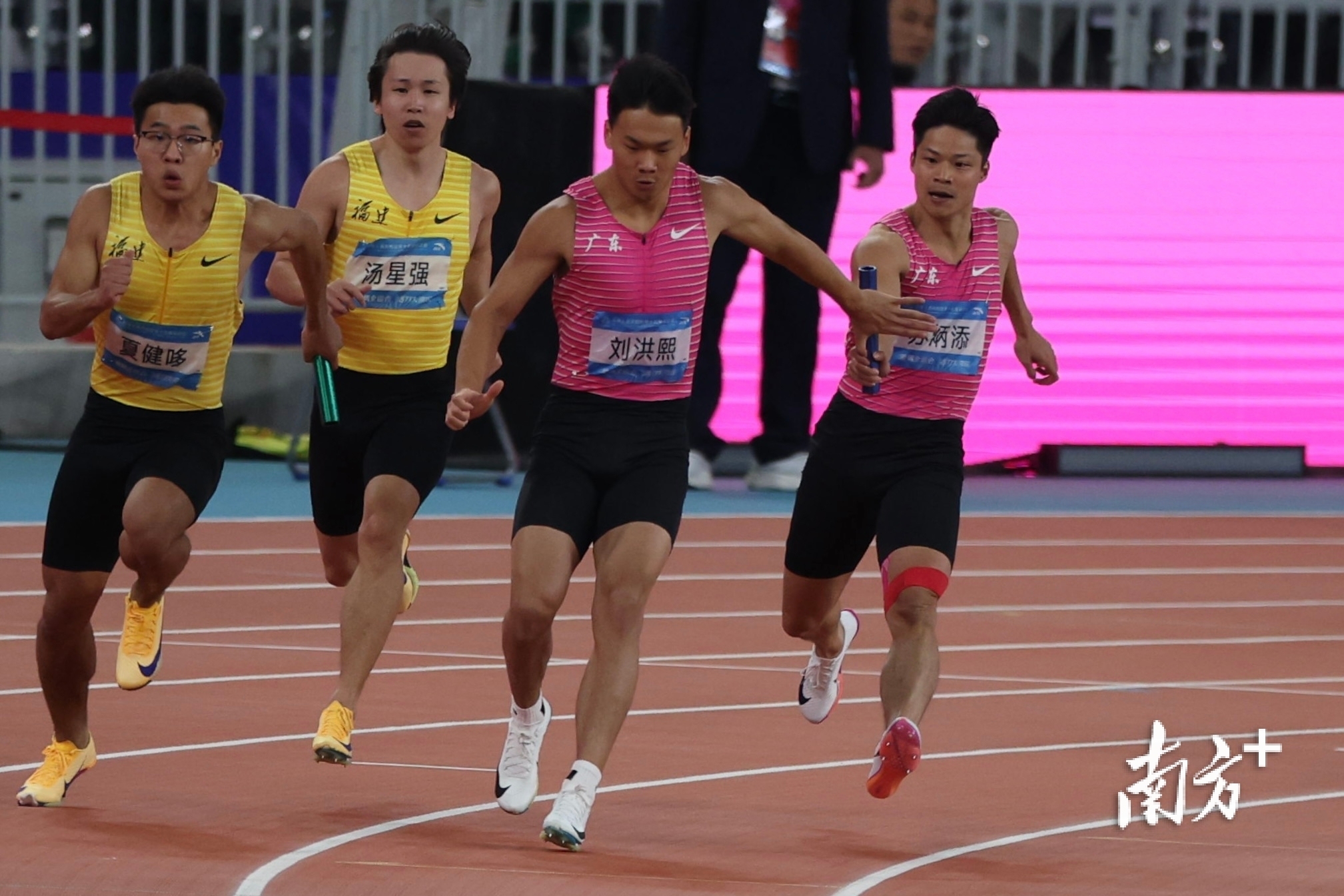 在备受瞩目的男子4×100米接力决赛中,由苏炳添、刘洪熙、施君豪、陈冠锋领衔的广东队在第二道出发,差0.03秒遗憾与领奖台失之交臂。湖北、江西、江苏队分获冠亚季军。