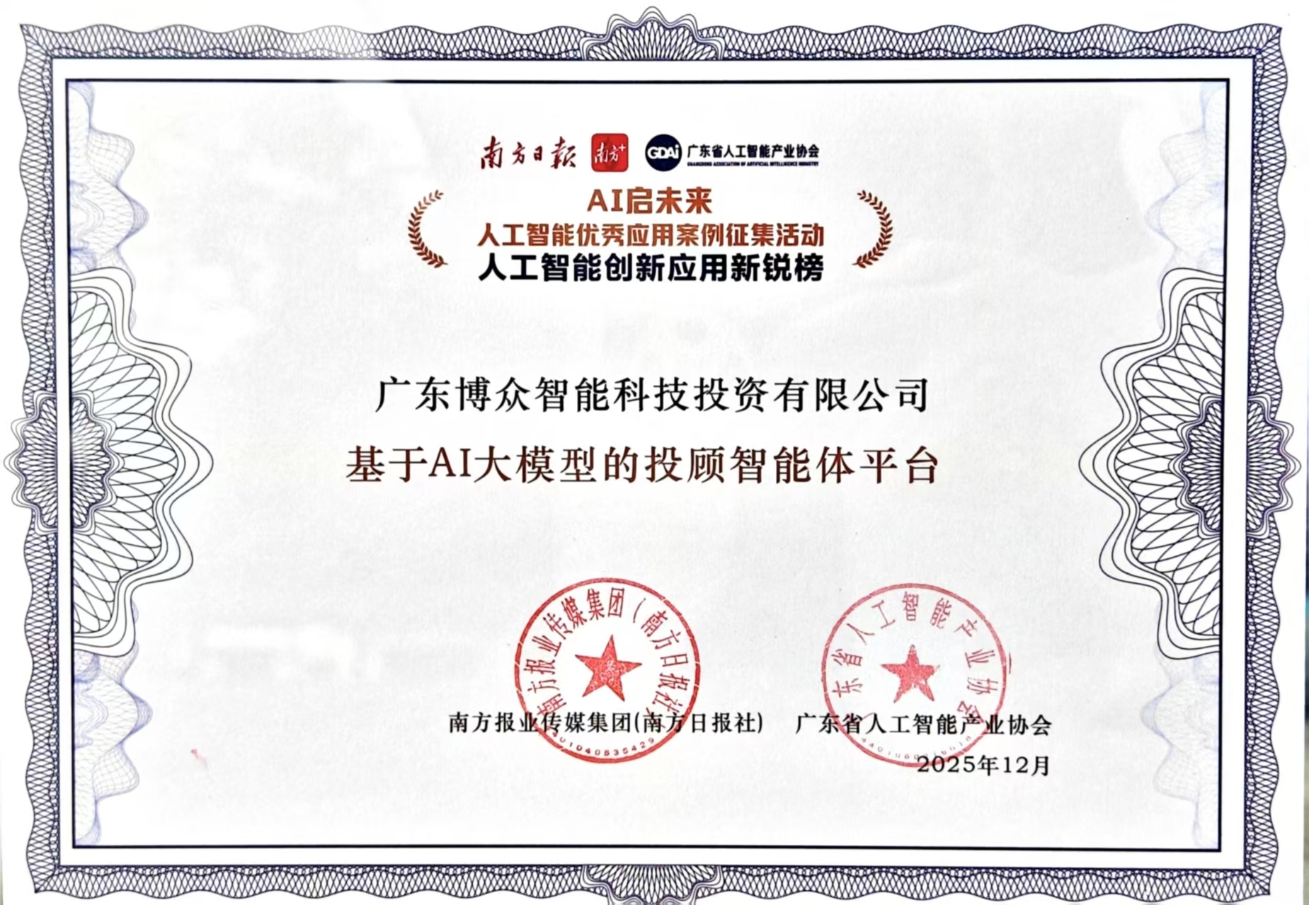 12月13日,在2025粤港澳大湾区人工智能和机器人产业大会暨广东省人工智能与机器人技能大赛上,“AI启未来——人工智能优秀应用案例征集活动”颁奖会举行。广东博众智能科技投资有限公司(下称“广东博众”)凭借其自主研发的“基于AI大模型的投顾智能体平台”,从150多个申报案例中脱颖而出,入选人工智能创新应用新锐榜。