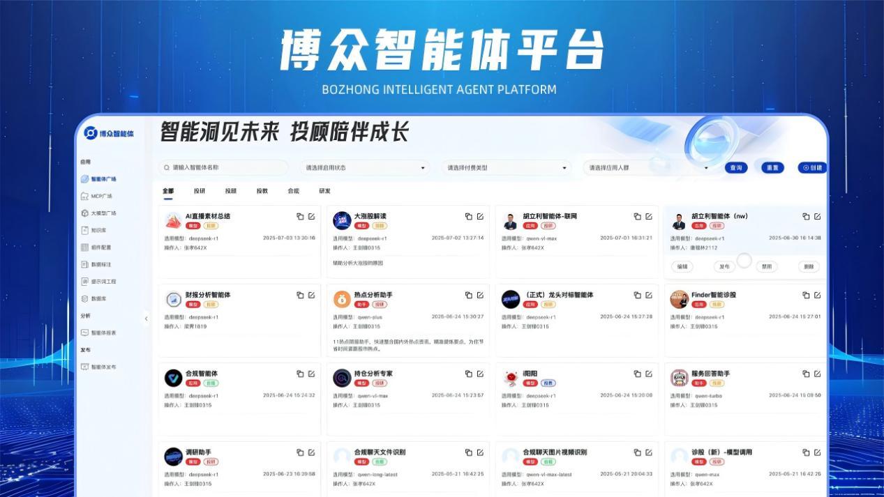 目前,博众投顾智能体平台已在核心业务环节孵化出六大智能体,初步形成“投—研—顾—教—管”一体化的AI服务矩阵。