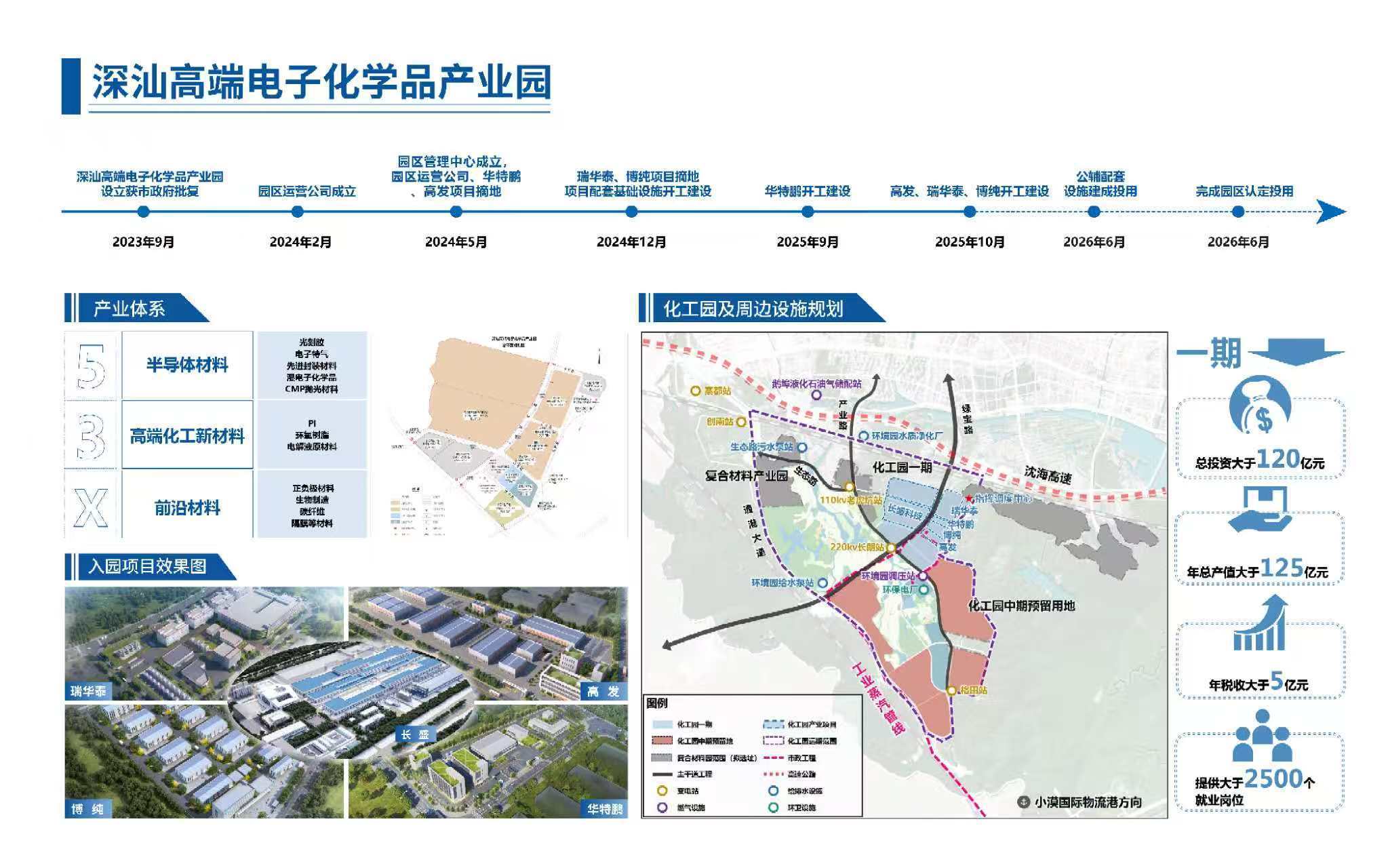 周贤太:这一定位是比较准确的。因为像珠海电子化工园目前也还在建设,而且更多是中试基地。深汕拥有独特的区位优势,可以填补区域高端电子化工园的空白,尤其是相关化工产业牌照比较稀缺,可以为高端电子化学品企业提供合规落地的载体。此外,深汕高端电子化学品化工园的产业聚焦度比较高,主要聚焦“卡脖子”材料的突破,深度融入深圳“20+8”产业集群,并提供关键供应链的支撑。