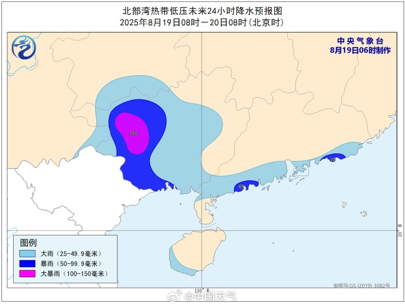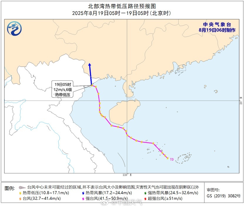 8月19日凌晨4点15分前后,北部湾热带低压的中心已在越南广宁省和海防市交界附近沿海登陆,登陆时中心附近最大风力有7级(14米/秒),中心最低气压为1002百帕。