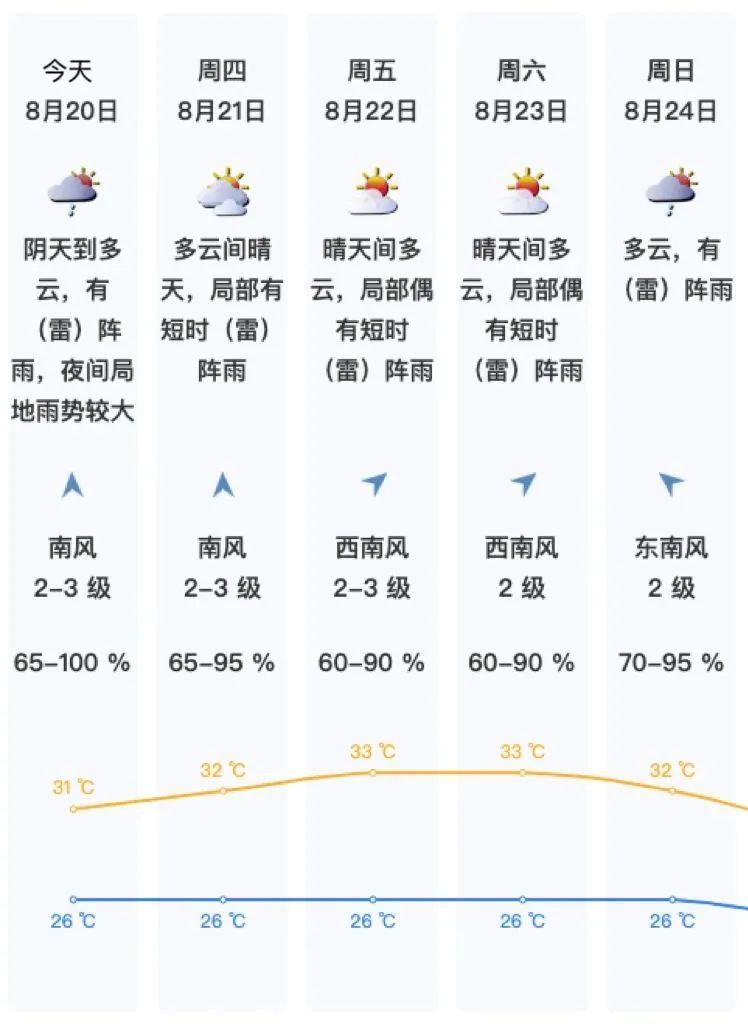 预计20日多云间阴天,有分散阵雨,最高气温31℃左右;