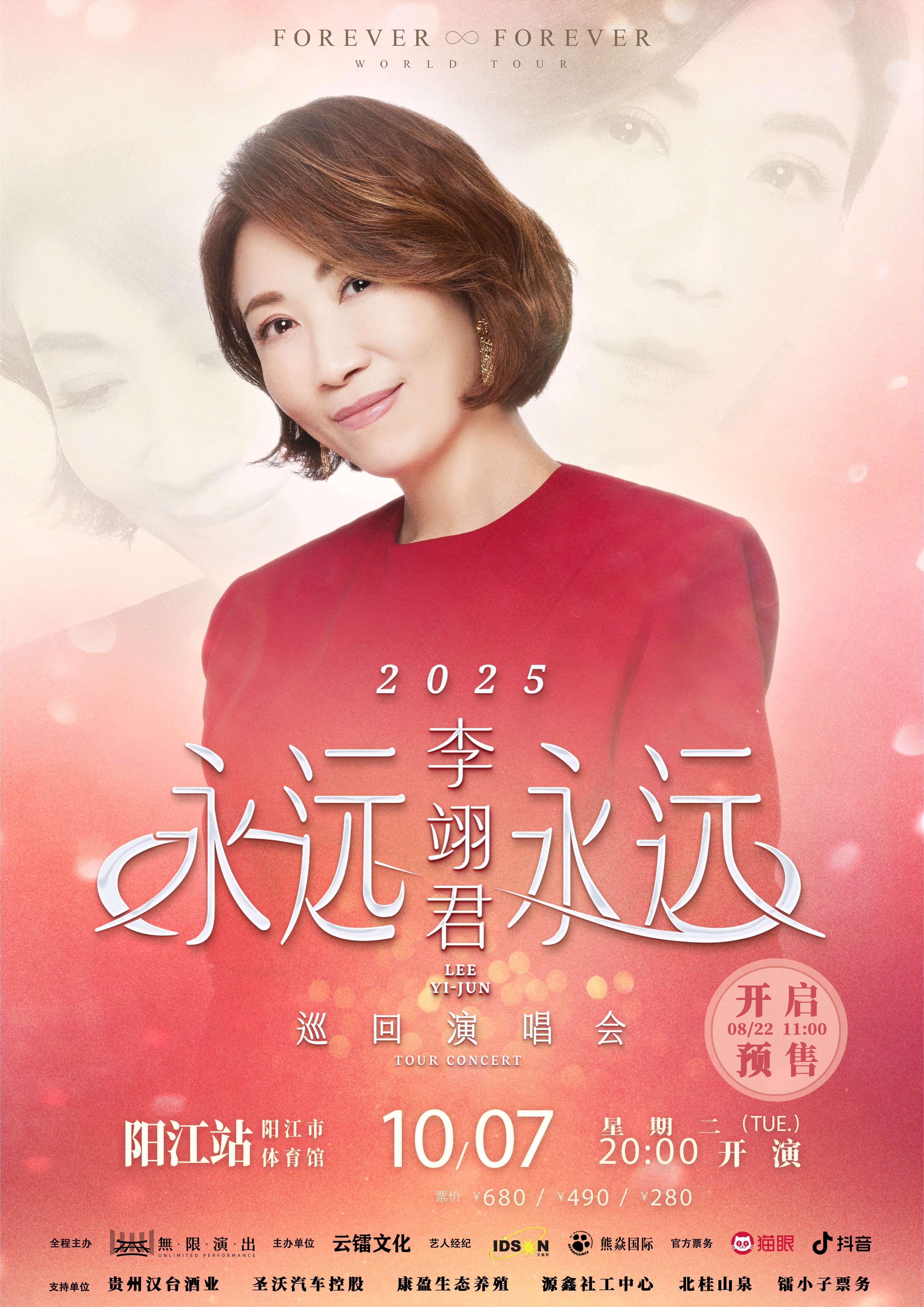 华语乐坛情歌天后李翊君“永远 永远”巡回演唱会正式官宣阳江站,演出将于10月7日20:00在阳江市体育馆深情开唱。本次演唱会预售通道定于8月22日11:00全面开启,门票设看台280元、看台490元及内场VIP680元三档价位。