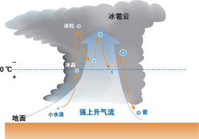 冰雹本质上是一种固态降水,它孕育于结构特殊的冰雹云之中。这种云层自下而上温度陡降:最底层温度在零摄氏度以上,充满了温暖的水滴;中间层温度介于零下20摄氏度至零摄氏度之间,是过冷水滴(温度低于0℃却未冻结)、冰晶和雪花共存的区域;最顶层则极度寒冷,温度低于零下20摄氏度,主要由冰晶和雪花构成。