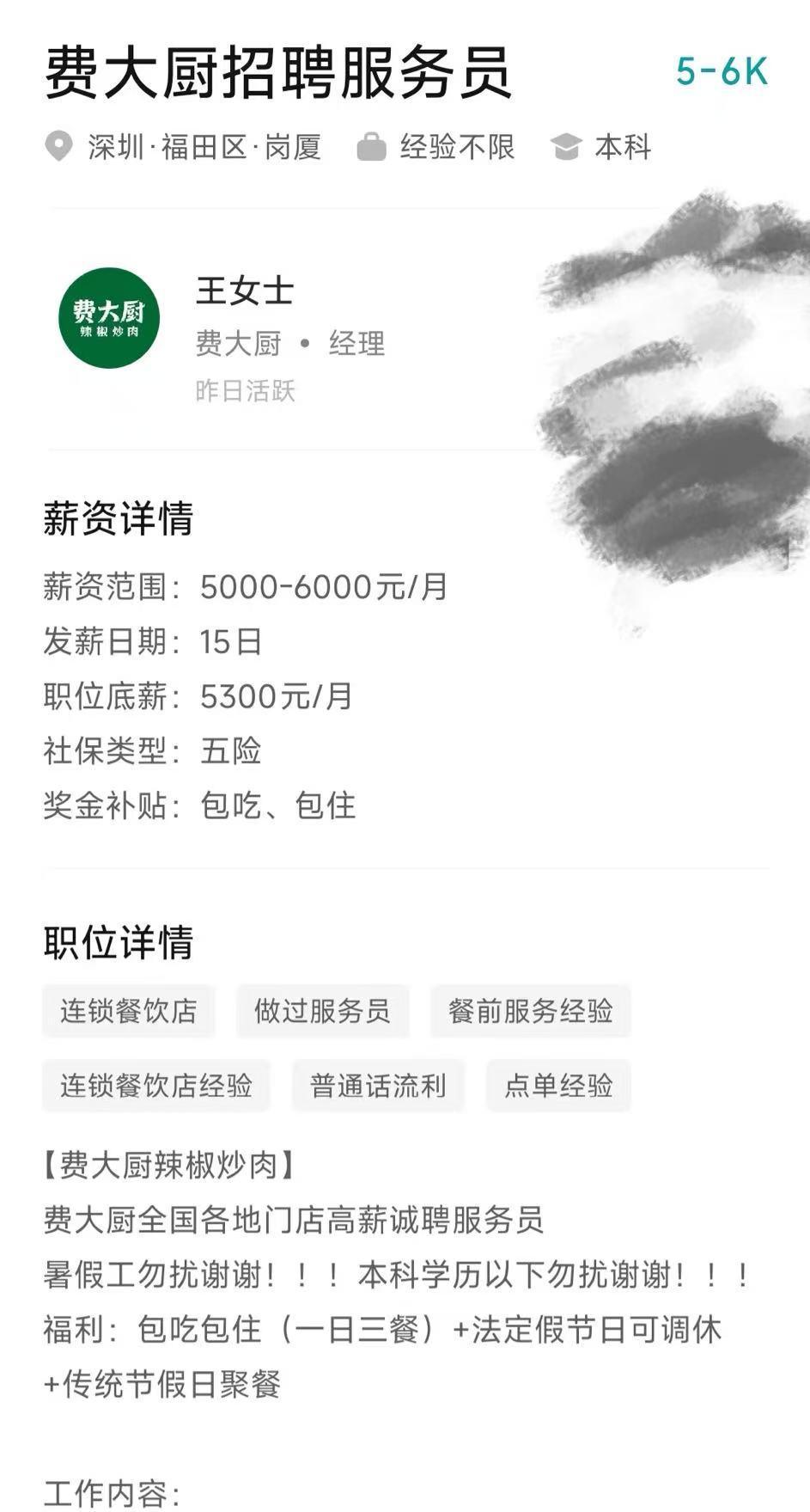南都湾财社记者注意到,根据网友发布的图片,费大厨深圳卓越中心门店在boss直聘小程序上发布招聘信息,表示费大厨全国各地门店高薪诚聘服务员,薪资范围5000-6000元/月,还写着“暑假工勿扰谢谢,本科学历以下勿扰谢谢”。据招聘信息,服务员的工作内容包括认真做好桌椅、餐厅卫生等等,年龄要求在16周岁以上等。