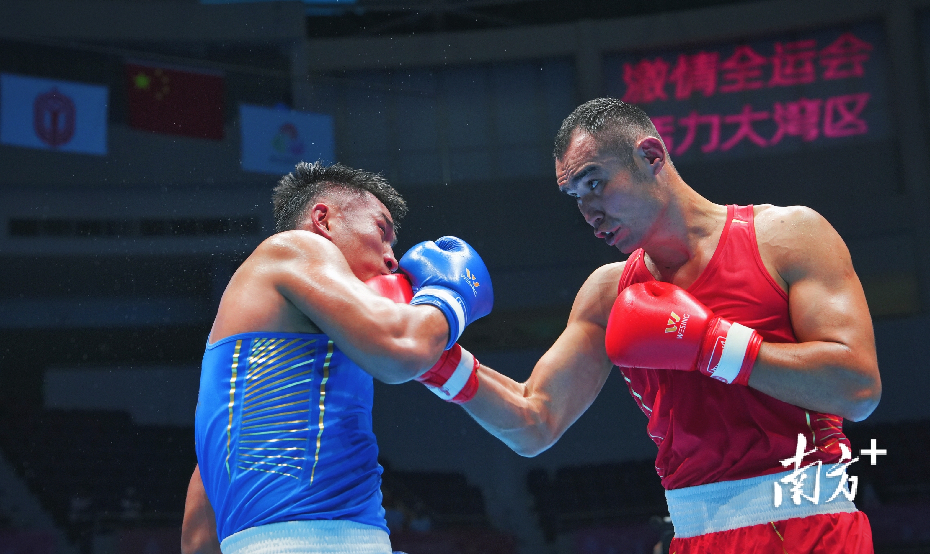 11月12日16时,十五运会拳击男子92公斤以上级决赛,广东队选手巴依克吾孜·达那别克(红衣)出拳击中对手瞬间。王俊涛 摄