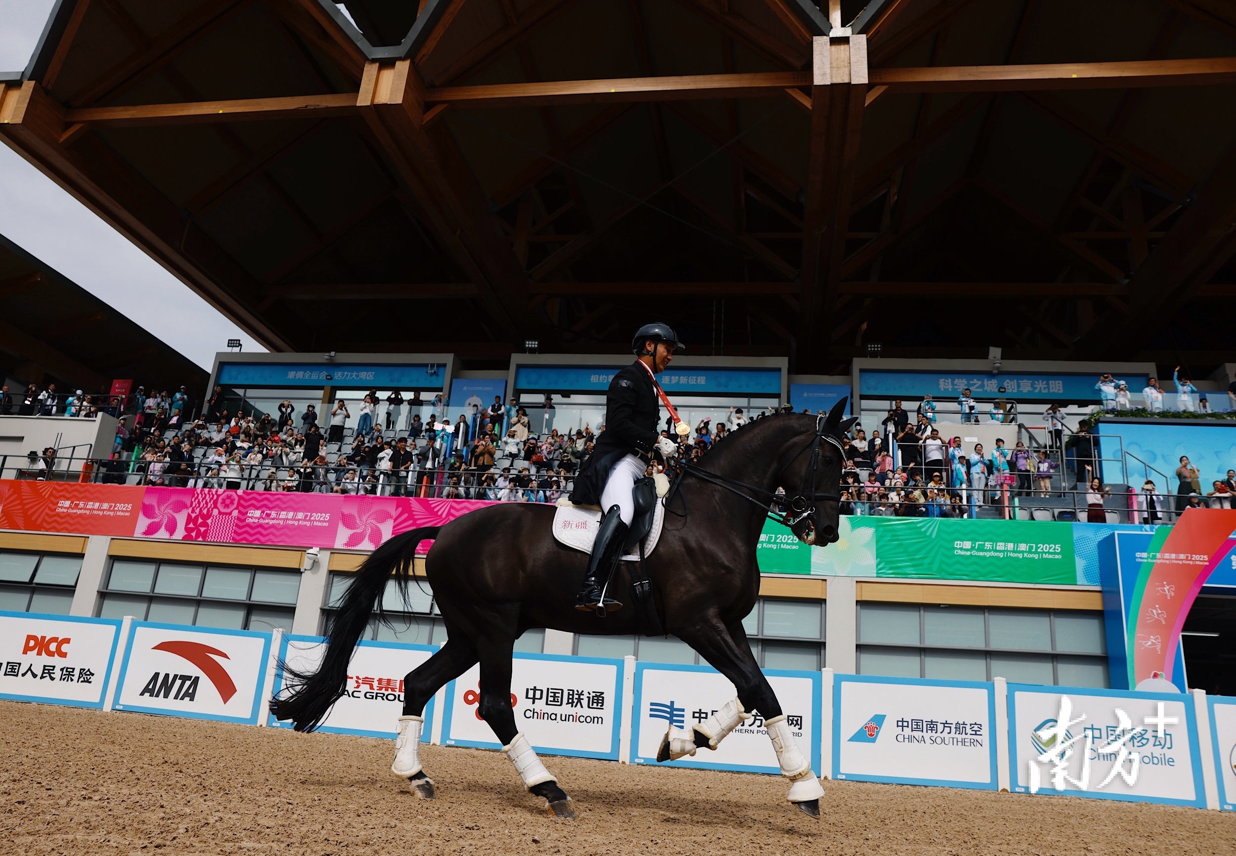 11月12日,第十五届全运会马术盛装舞步个人决赛,新疆队刘涛夺得金牌。颁奖仪式结束后,他骑着爱马环场两圈,接受观众的欢呼。张由琼 摄