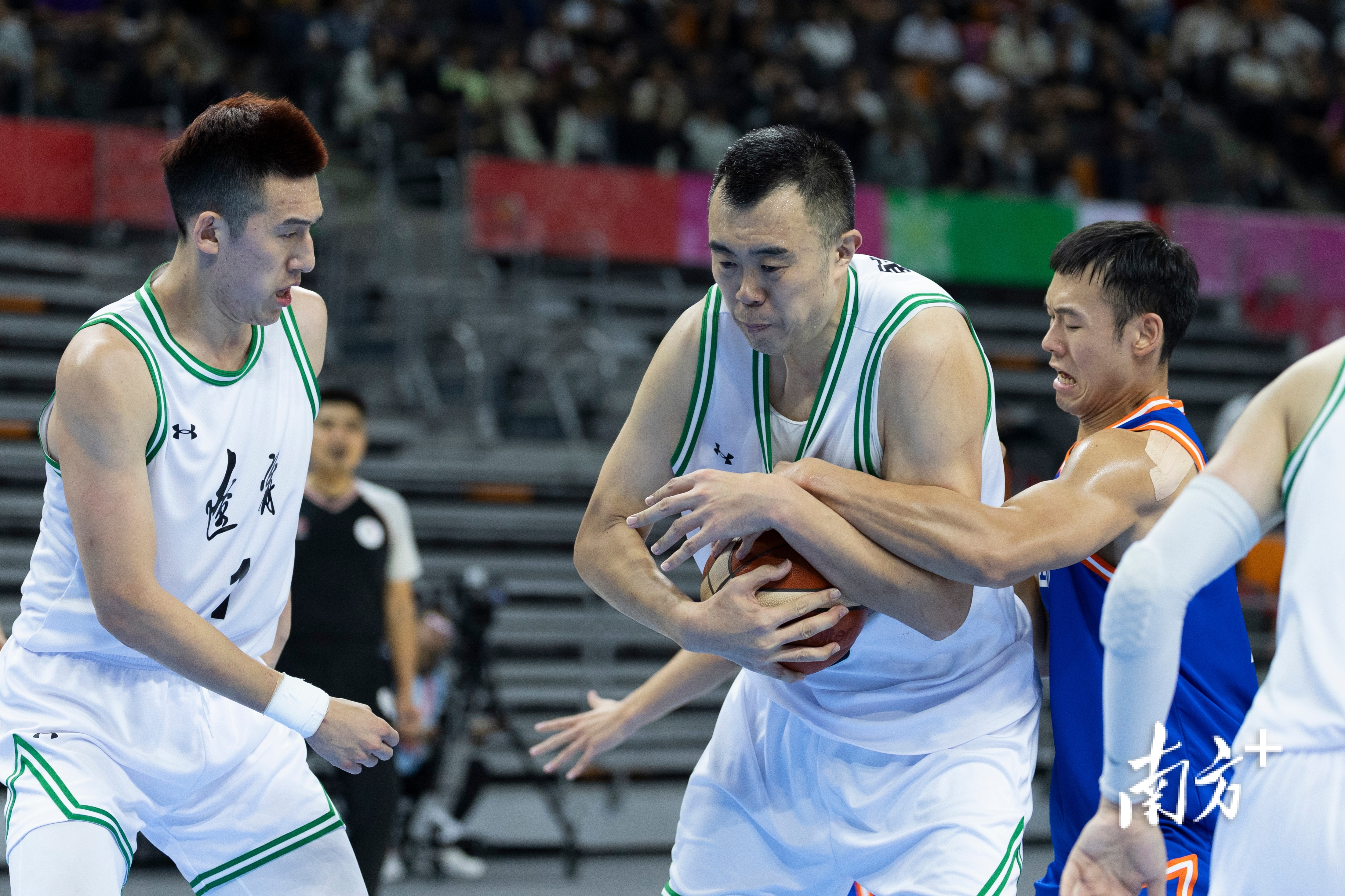 十五运会男篮成年组铜牌赛中,四川81:60战胜辽宁获得铜牌,辽宁功勋中锋韩德君宣布退役后选择在十五运会完成职业生涯的“最后一舞”,图为韩德君抢到篮板后死死抱住,脸上现出青筋。梁钜聪 摄