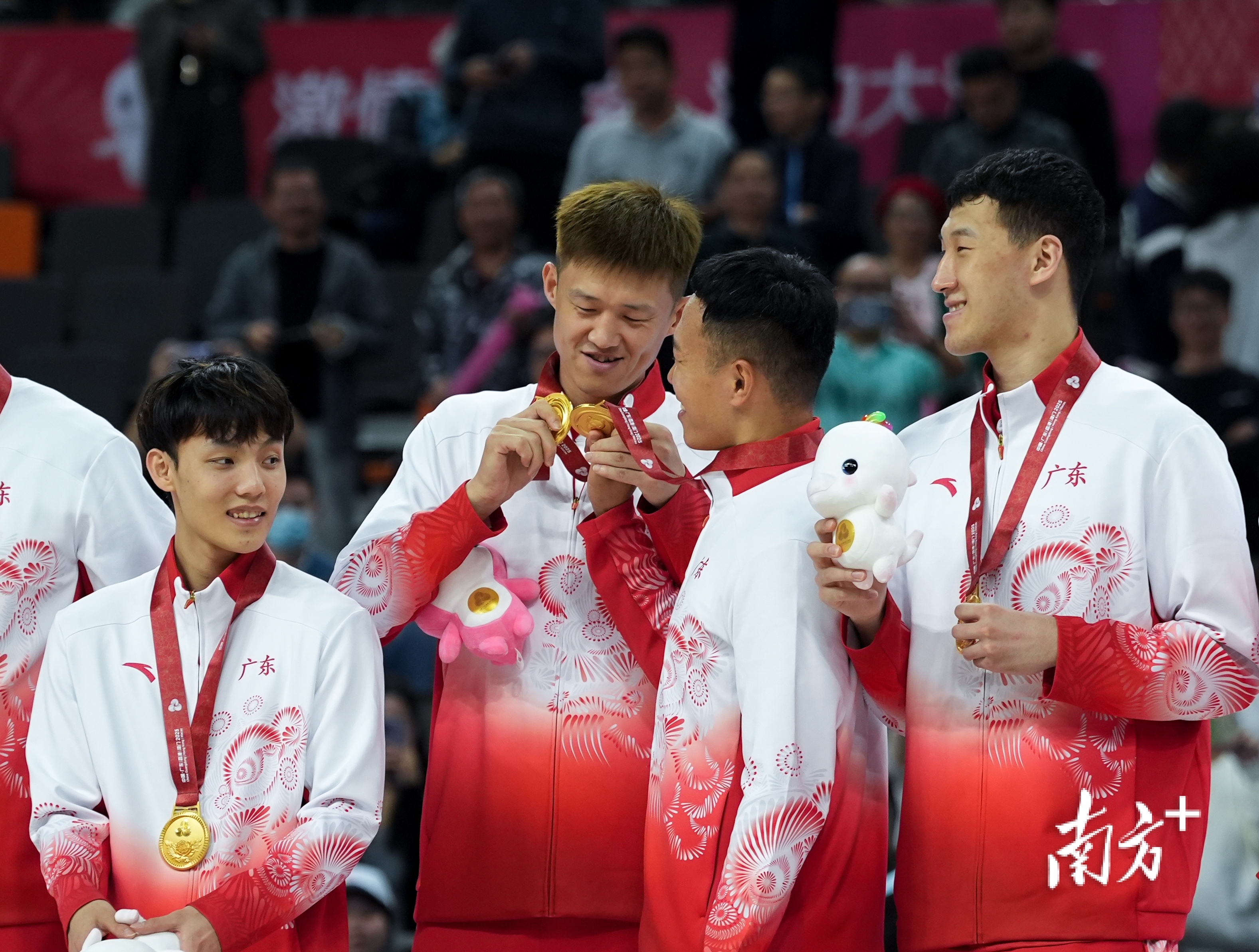 十五运会男篮成年组决赛中,广东男篮以101:65战胜浙江队,颁奖仪式上队员们相互观赏奖牌。钟志辉 摄