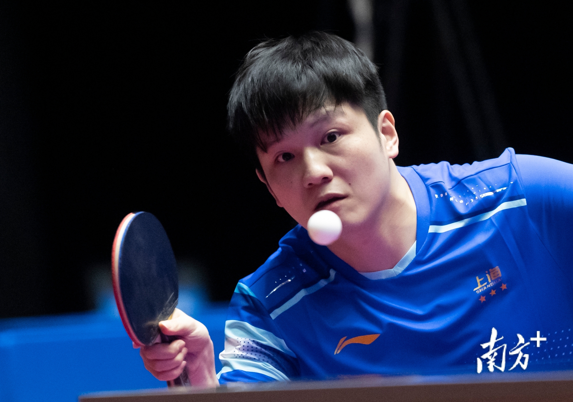 上海队樊振东紧盯着飞来的乒乓球。董天健 摄