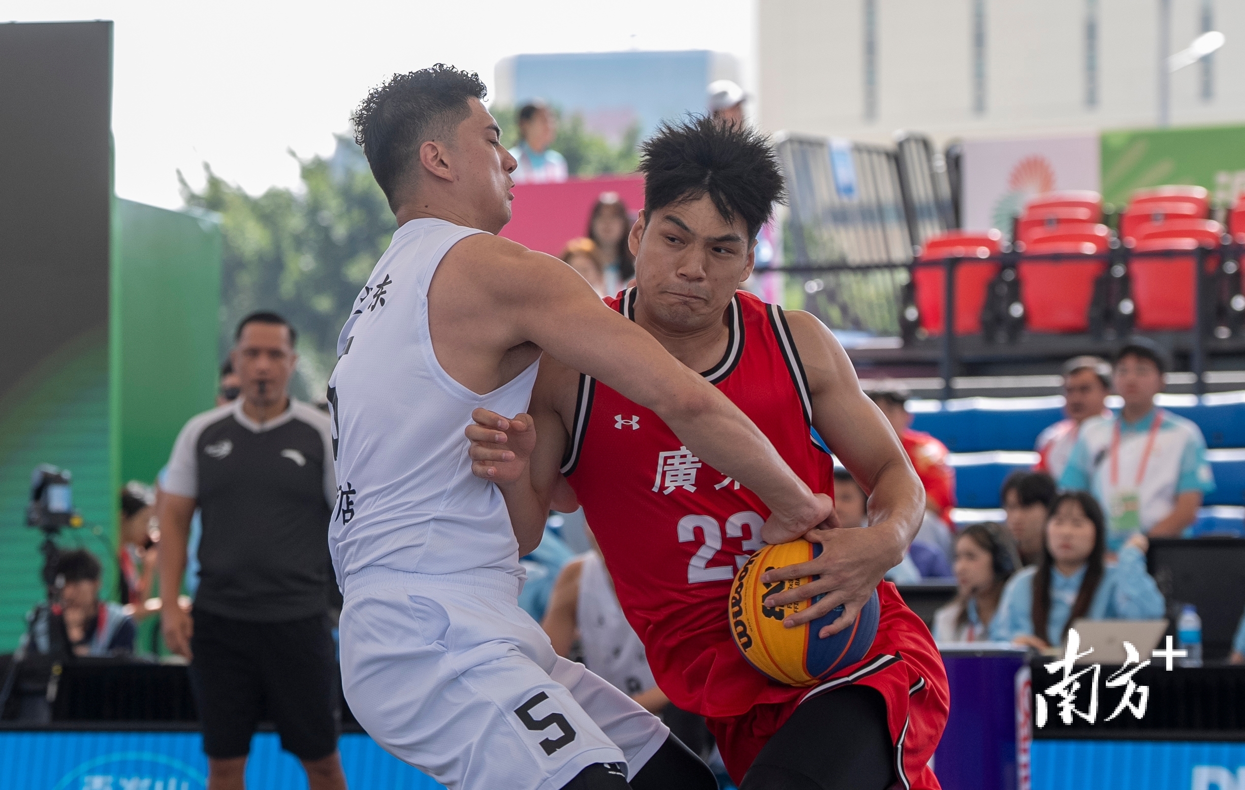 在澳门举行的第十五届全国运动会三人篮球男子组小组赛中,广东队陈国豪在江苏队的防守下艰难突破。董天健 摄