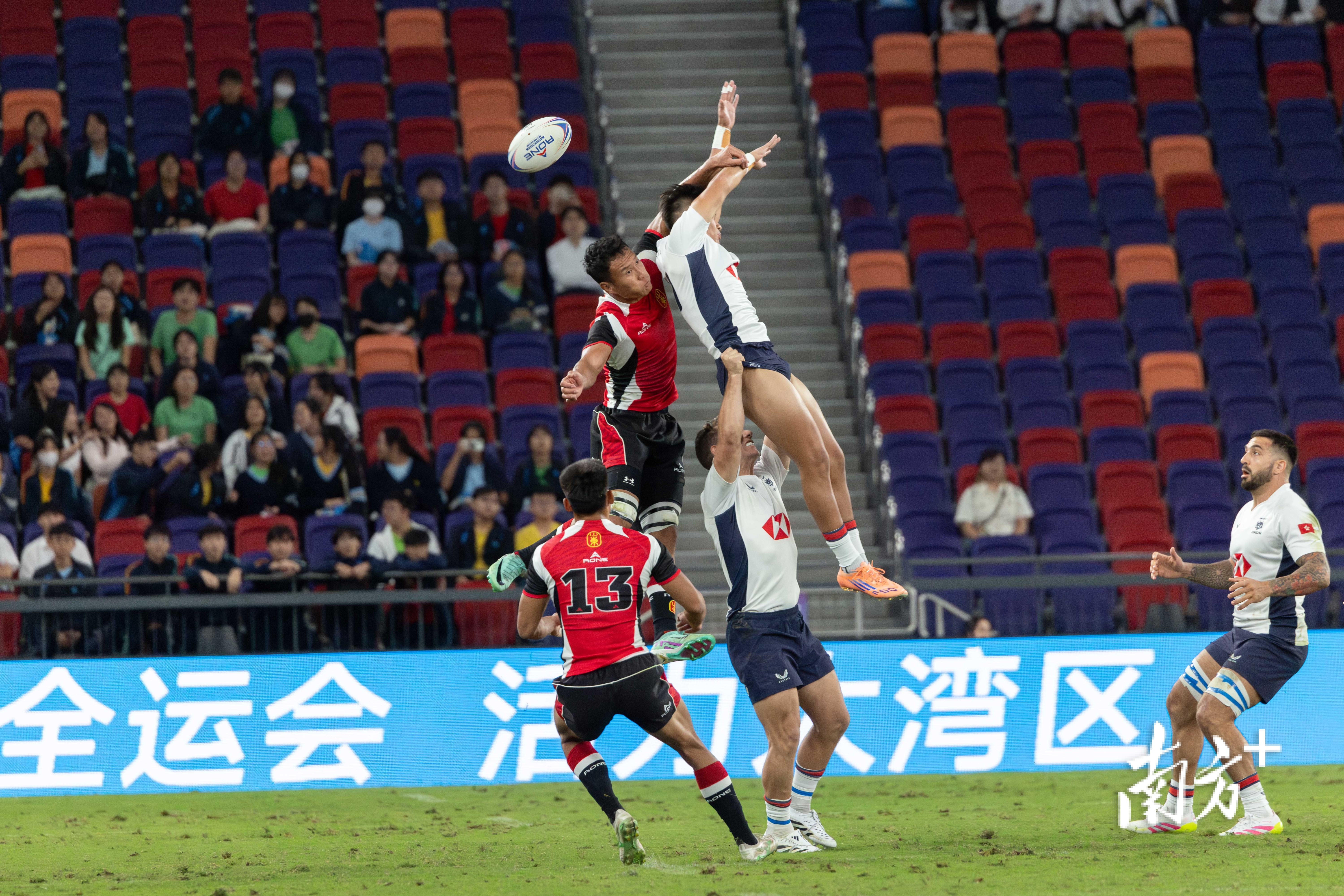 11月12日,第十五届全国运动会7人制橄榄球比赛在香港启德体育园启德主场馆正式拉开战幕。男子小组循环赛中,香港与山东双方球员在空中争球。苏韵桦 摄
