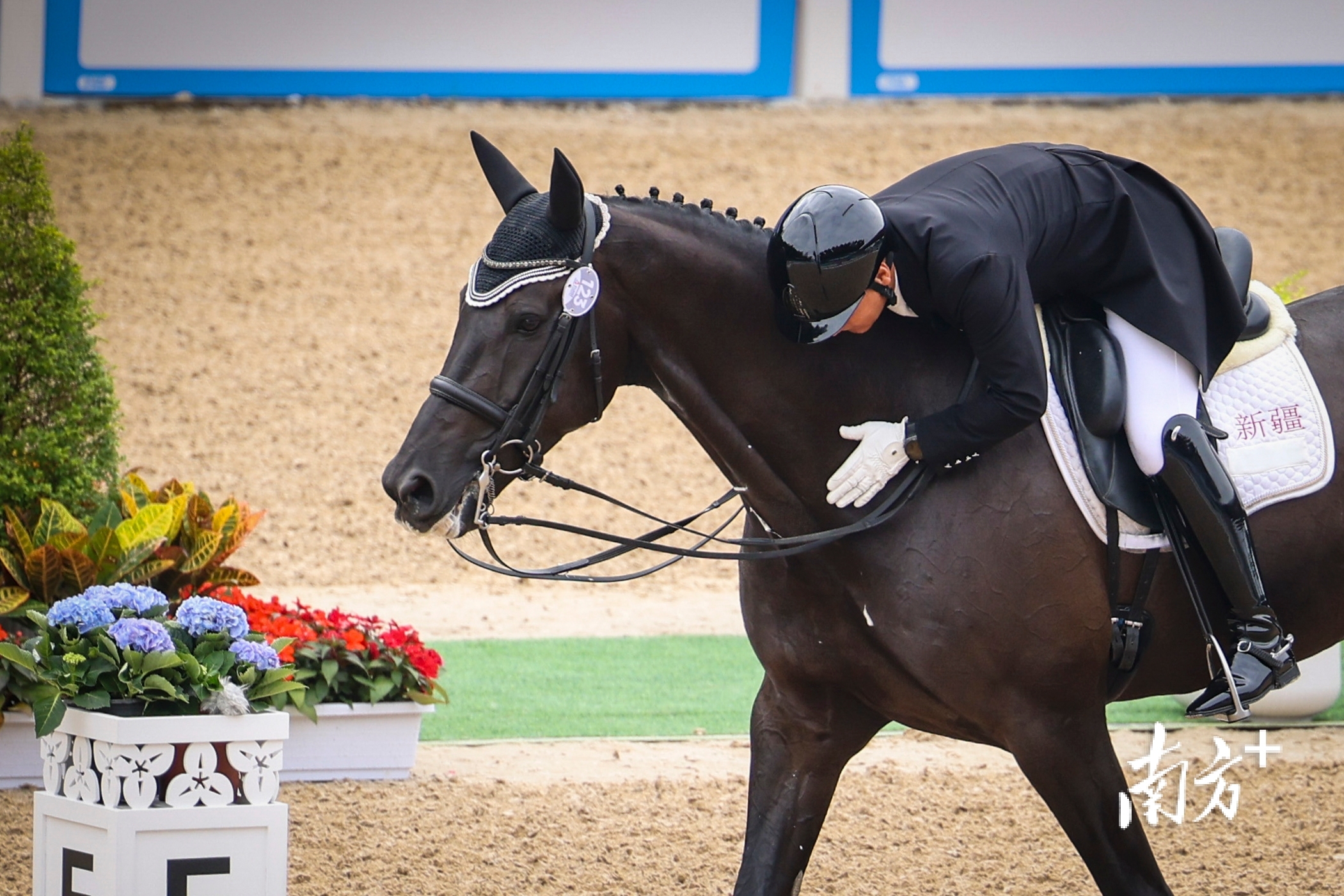 11月12日,第十五届全运会马术项目盛装舞步个人赛决赛在深圳市光明国际马术中心开赛,新疆队刘涛以72.425的高分荣获冠军。赛后,刘涛轻拍马背,与搭档默契互动。朱洪波 摄