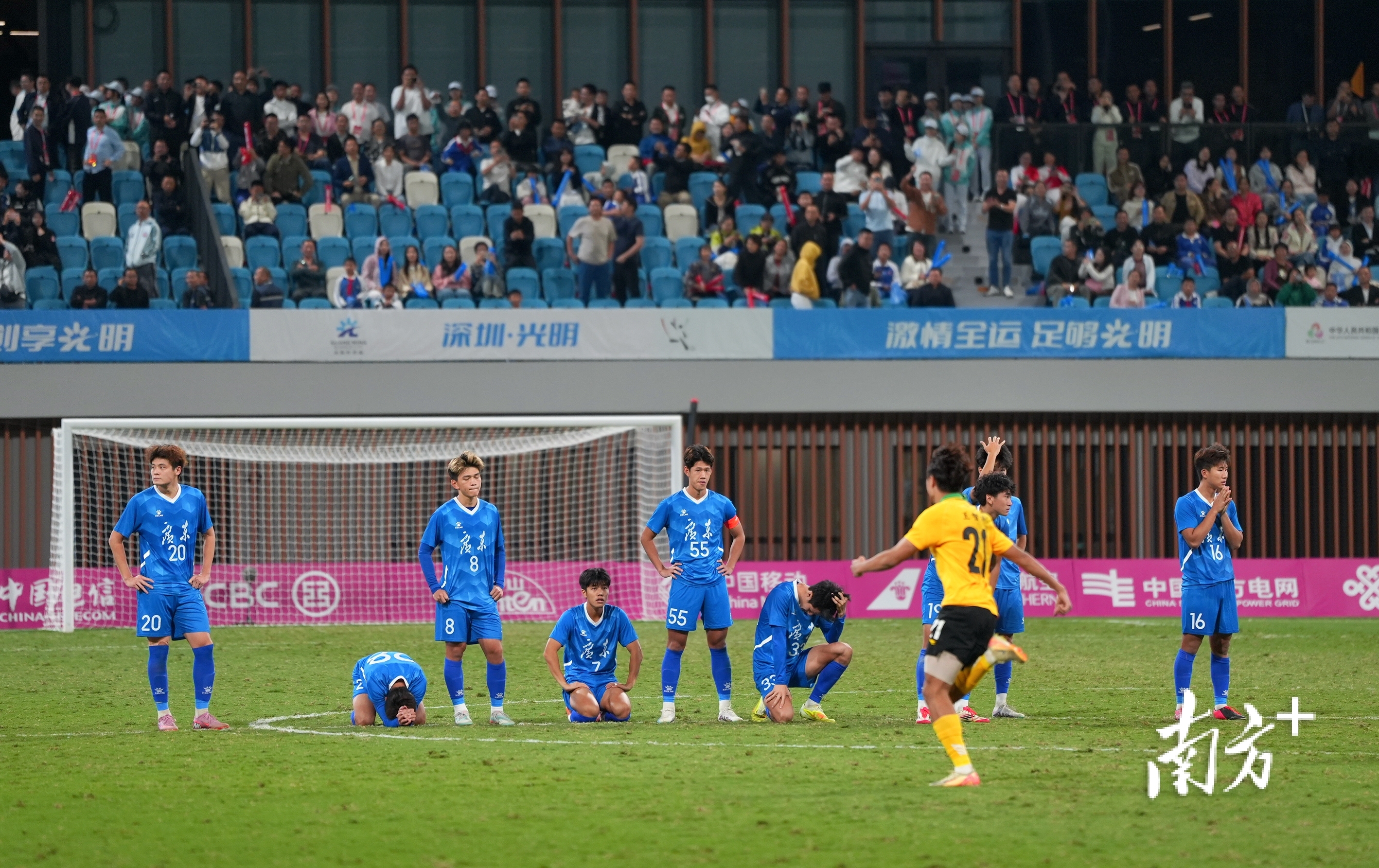 11月12日晚,全运会U20男子足球决赛在深圳打响,广东主场迎战湖北,双方鏖战120分钟,1-1打平进入点球大战。最终湖北队在点球大战中5-3战胜广东,广东队球员目视湖北队球员飞奔庆祝。王俊涛 摄