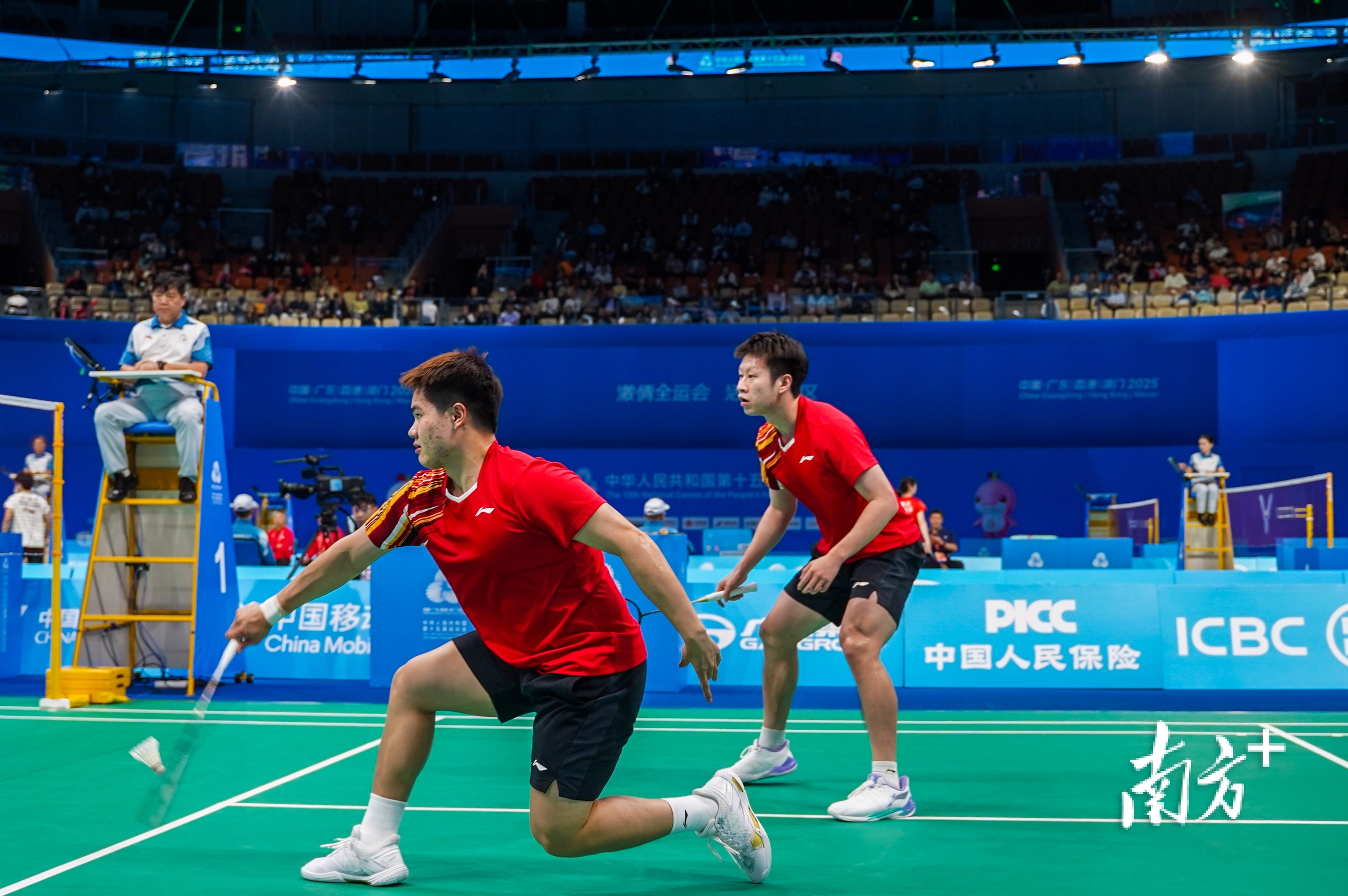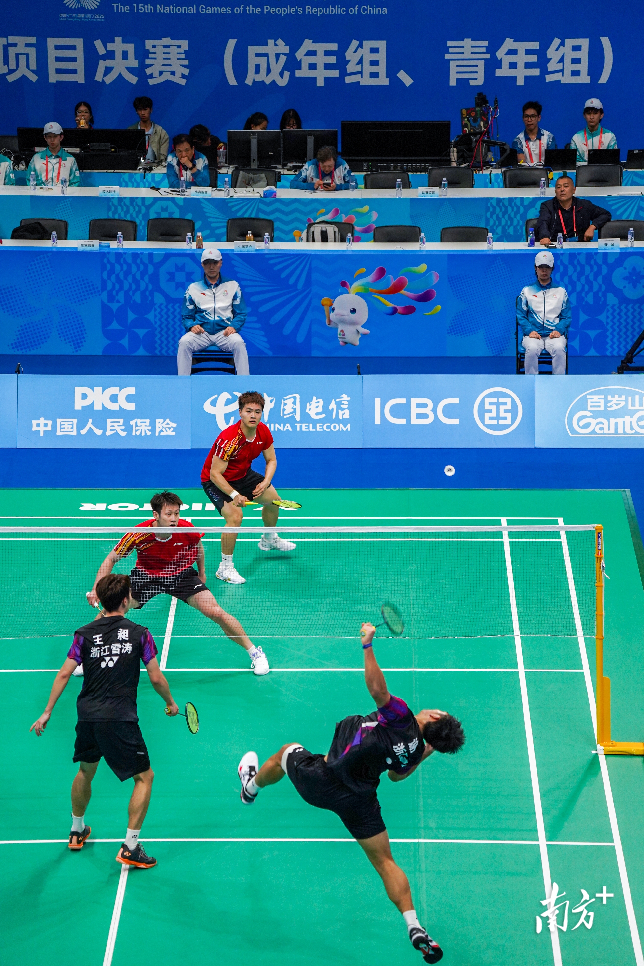 11月12日晚,十五运会羽毛球男子团体半决赛第一场男双比赛中,广东队选手梁伟铿、任翔宇和浙江队选手王昶、谢浩南正在激战中,最终广东队大比分2:3不敌浙江队遗憾落败。吕诗俊 摄