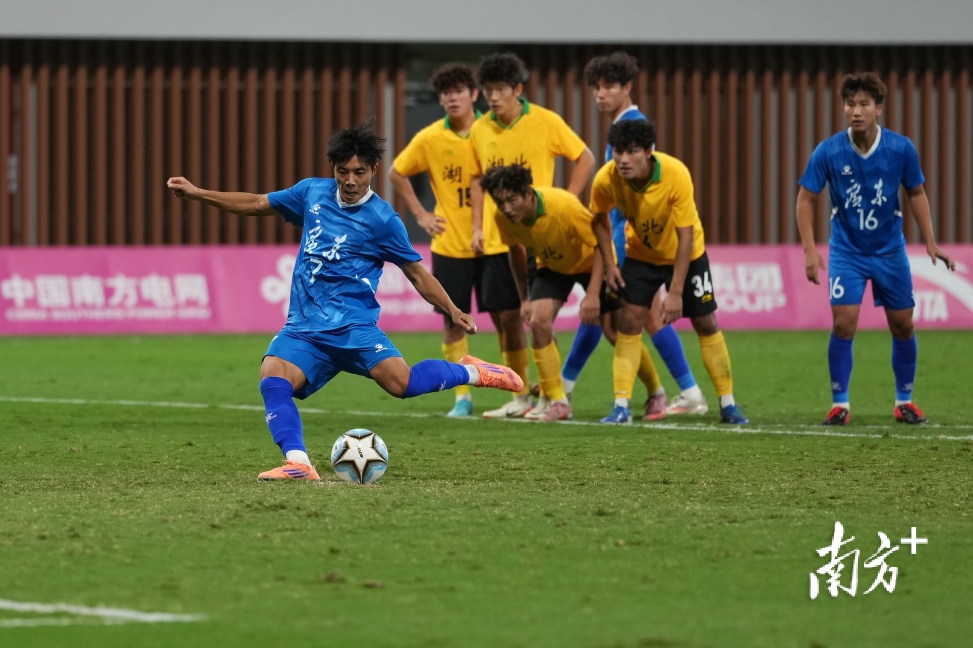 广东队钟文在下半场射进一个点球,为广东队取得领先。姚志豪 摄