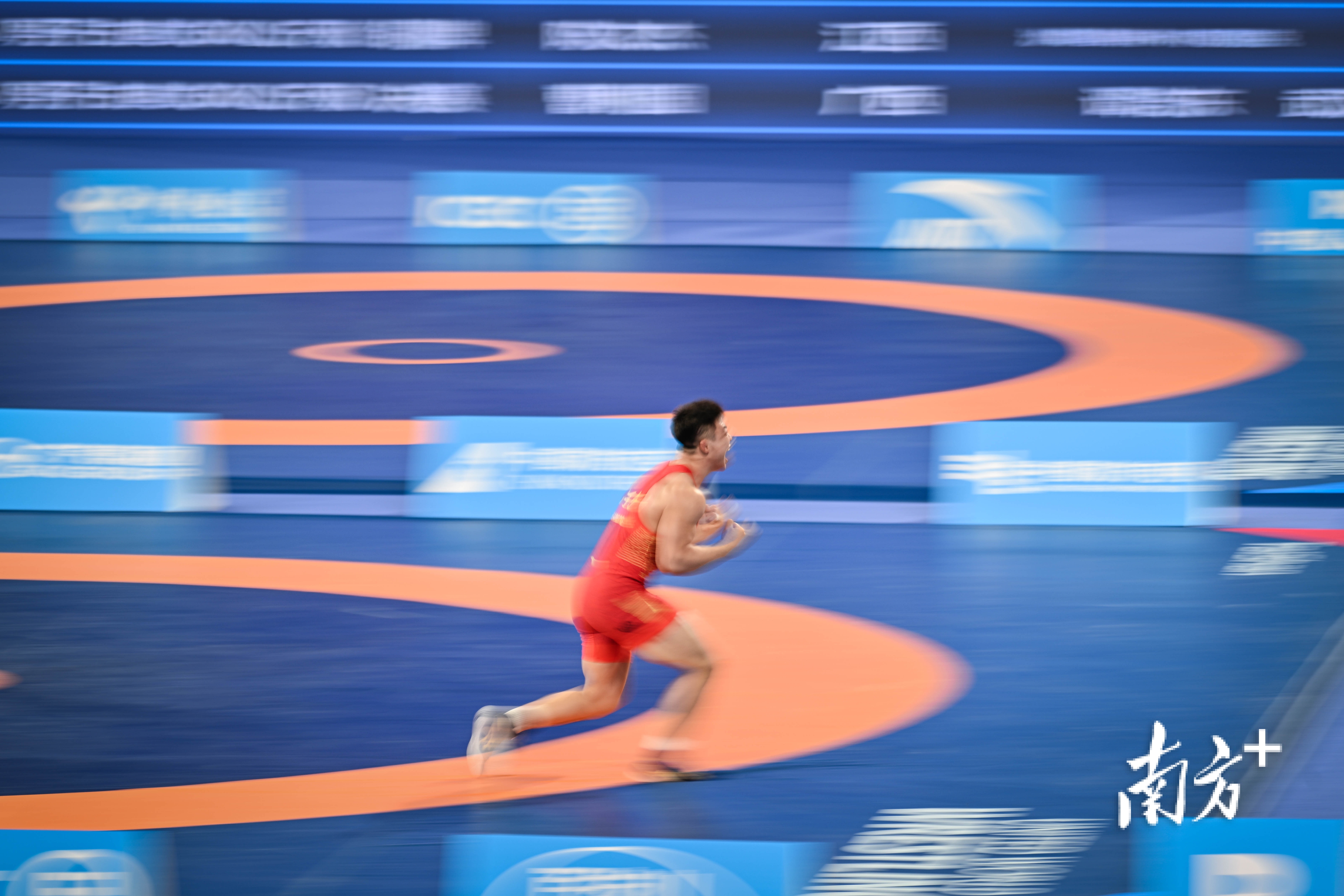 11月12日下午,十五运会摔跤赛事在清远开赛。在男子自由式85公斤级铜牌赛中,河南选手张恒斩获胜利后,带着满腔喜悦欢呼飞奔。曾亮超 摄