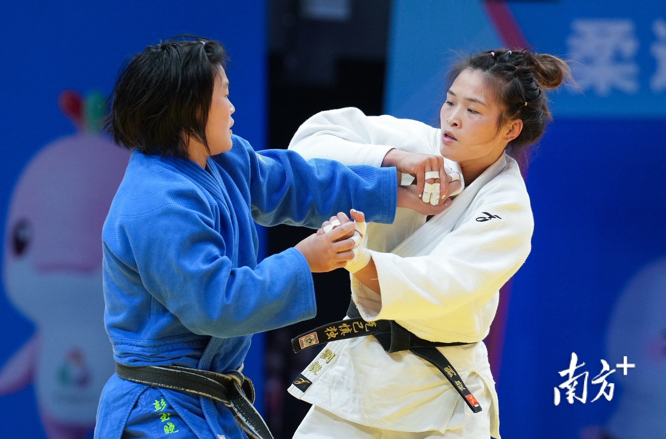 广东选手刘毅(白衣)在柔道女子78公斤级比赛中战胜山东选手彭玉晓,为广东队夺得首枚柔道金牌。卢逸轩 摄