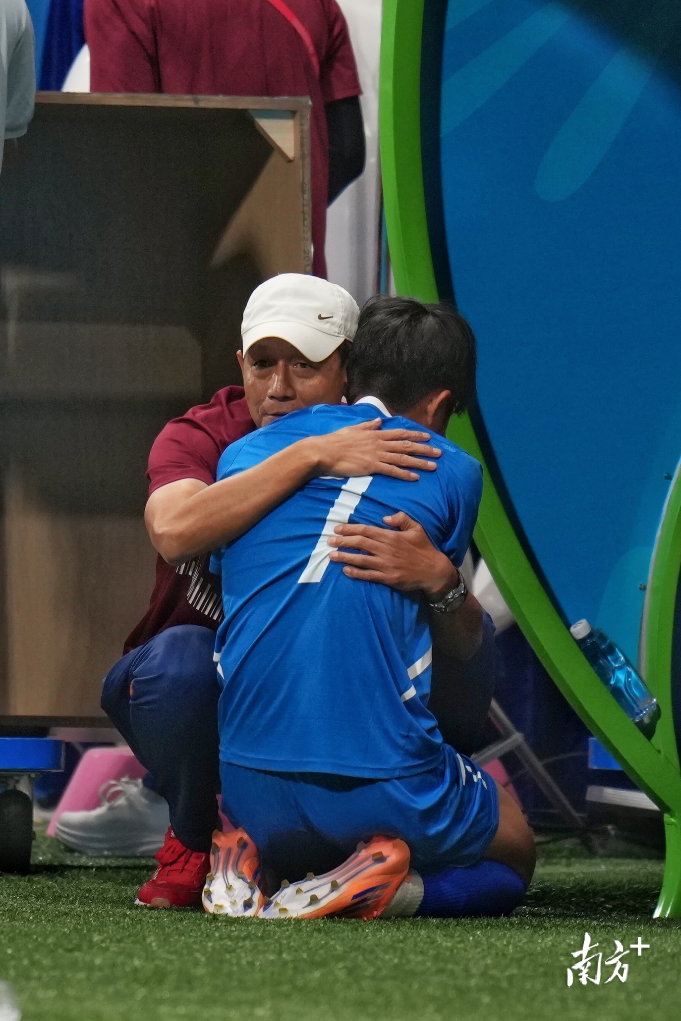 比赛结束后,广东队主教练王宝山拥抱安慰钟文。姚志豪 摄