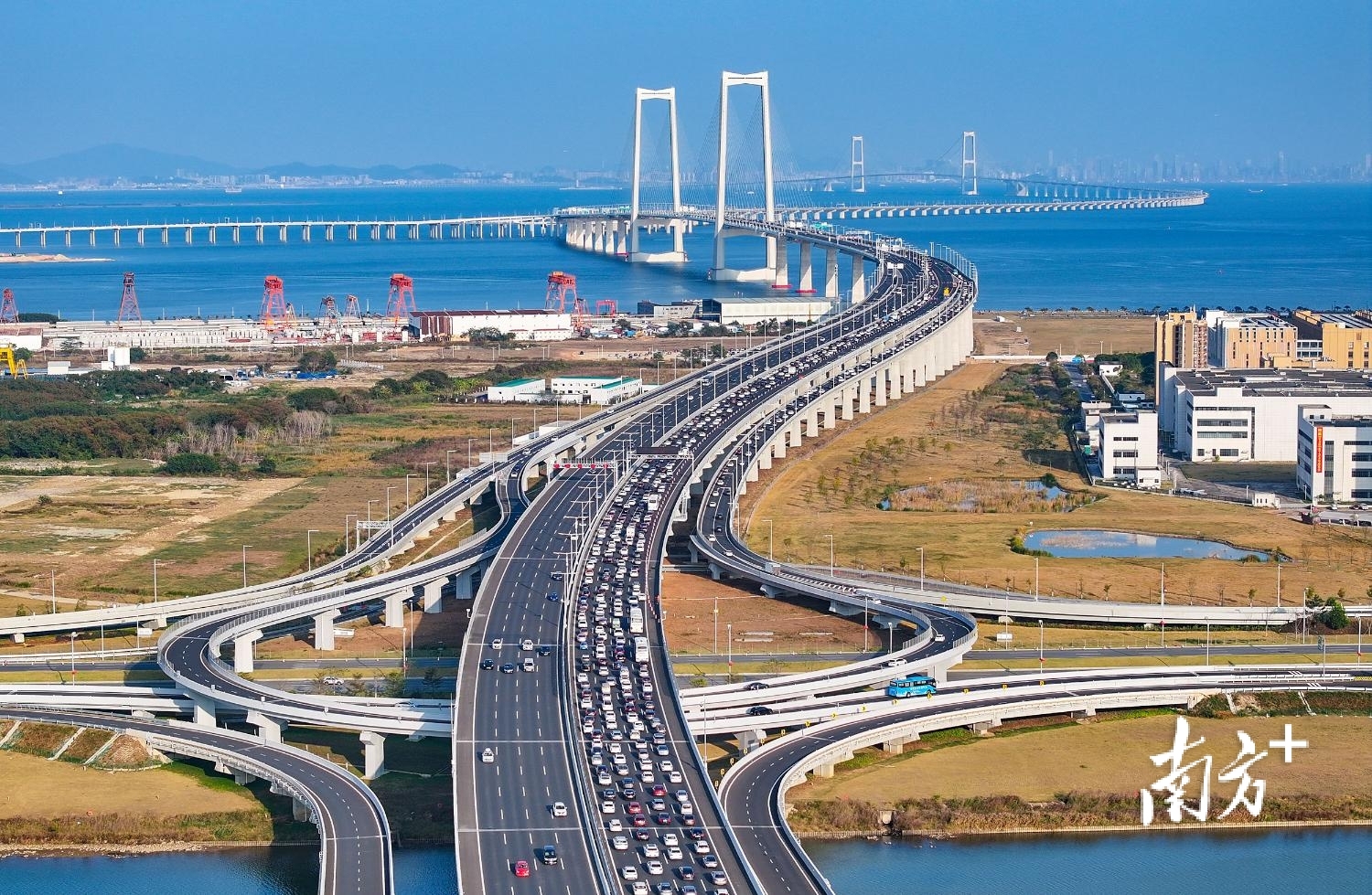 秋阳夕照,伶仃洋面浮光跃金,深中通道如银龙入海。