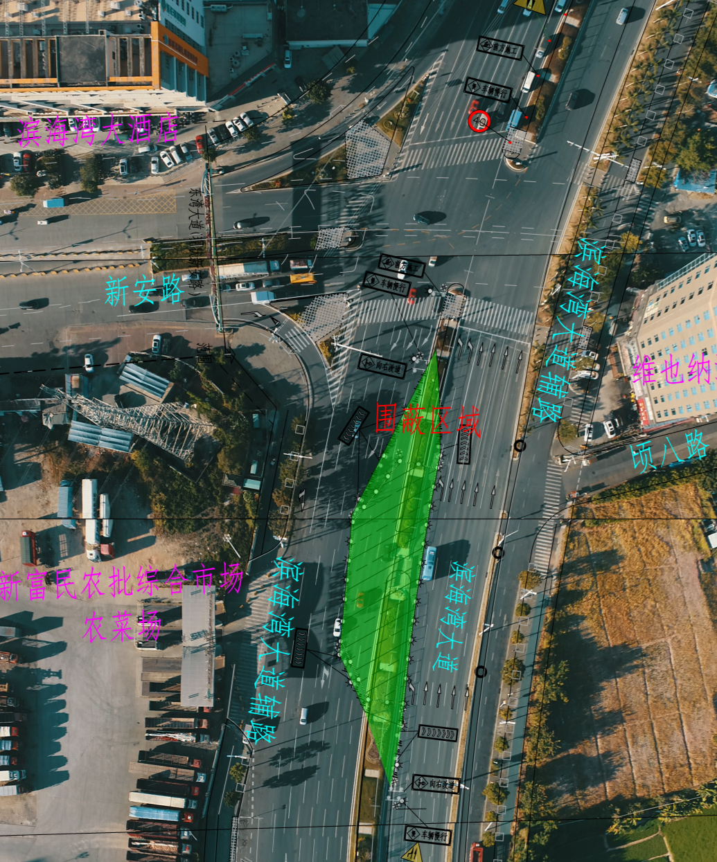 滨海湾大道与新安路交叉口以南,占道施工长度约100米。